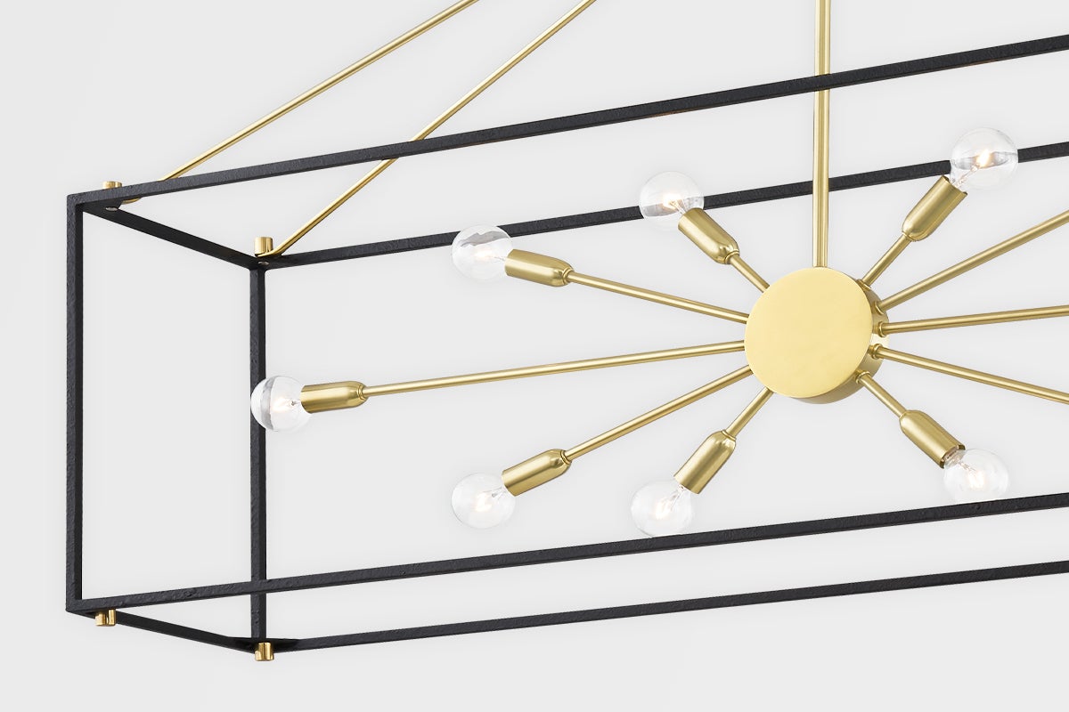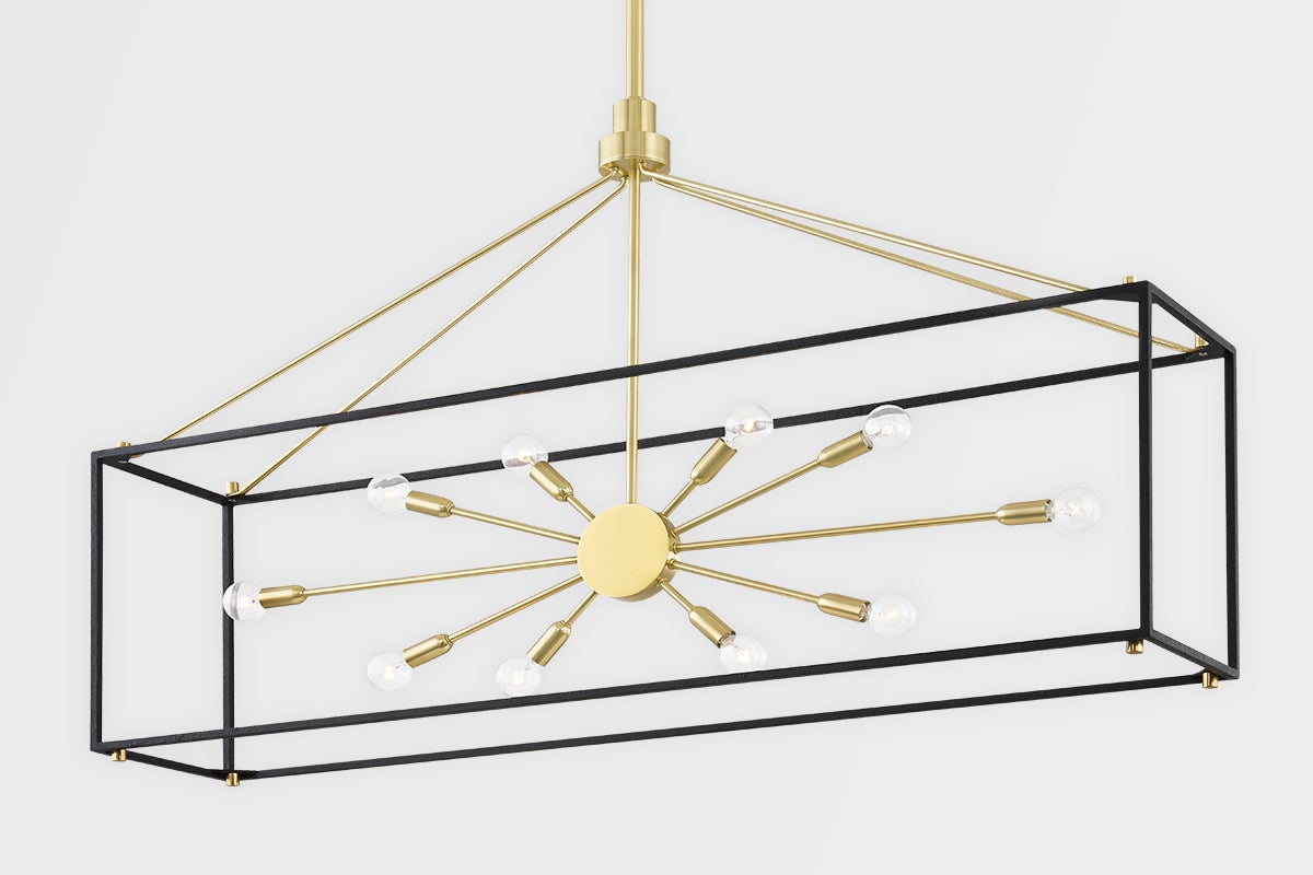 The Glendale Chandelier by Hudson Valley Lighting is a stunning centerpiece for any space, featuring a classic design with modern elements. It holds ten E12 candelabra base bulbs (not included), each with a maximum wattage of 60W, ideal for creating a warm and inviting atmosphere. With dimensions of 10 inches in width, 28.33 inches in height, and a length of 48 inches, this chandelier is sure to make a statement. Available in two elegant finish options: Aged Brass/Black (AGB/BK) and Polished Nickel/Black (PN/BK), it is not plug-in but is rated for UL Damp locations, making it versatile for various settings.