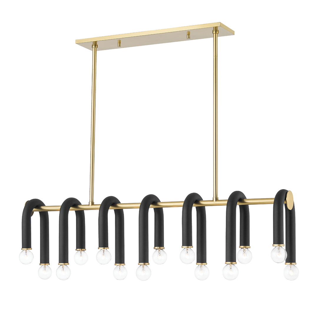 The Mitzi 14-Light Chandelier showcases a modern design with its aged brass and black or polished nickel and black finish options, making it a versatile addition to any space. With a width of 6.50 inches, height of 11.00 inches, and an extension of 8.50 inches, this chandelier is compact yet impactful. It accommodates 14 E12 candelabra base bulbs (not included) with a maximum wattage of 40W each, ensuring ample illumination. Rated for UL Damp conditions, this fixture is suitable for humid environments, adding elegance and functionality to your home.