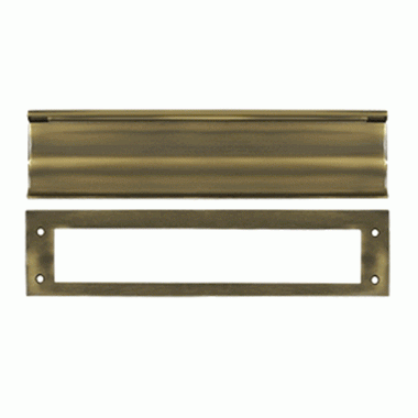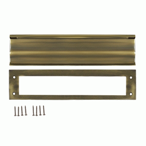 13 Inch Brass Mail & Letter Flap Slot (Antique Brass Finish) - measures 3 1/16 inches by 13 inches. This slot has an opening of approximately 11 inches wide and 2 inches tall. Comes with both sides. Exterior flap is spring-loaded and this comes with a back finish plate. For use on both wood and metal doors.