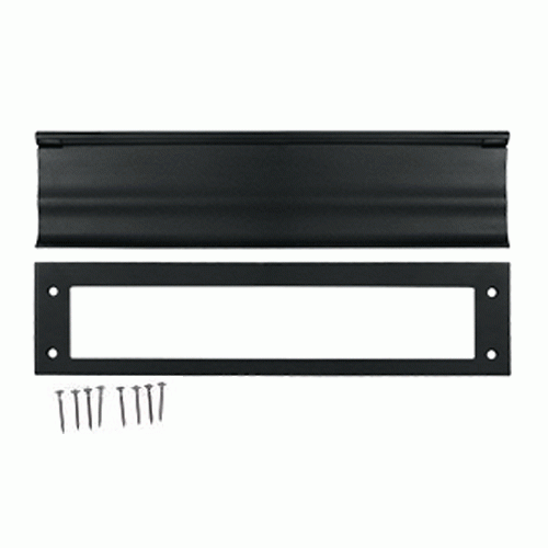 Available in Polished Brass, Antique Brass, Oil Rubbed Bronze, Satin Nickel, Antique Nickel, Black (shown), Chrome, Brushed Chrome and Lifetime PVD Brass. Comes complete with the mounting hardware. For hollow core doors, a mail sleeve is also available (part number MSS005).