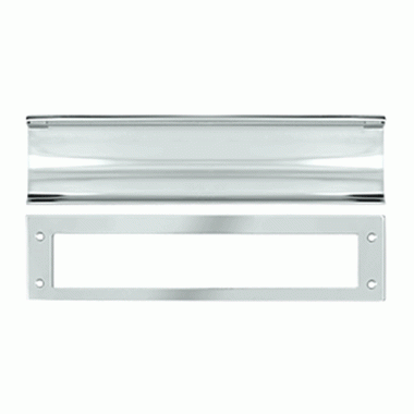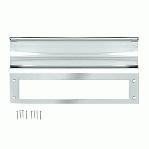 Available in Polished Brass, Antique Brass, Oil Rubbed Bronze, Satin Nickel, Antique Nickel, Black, Chrome (shown), Brushed Chrome and Lifetime PVD Brass. Comes complete with the mounting hardware. For hollow core doors, a mail sleeve is also available (part number MSS005).