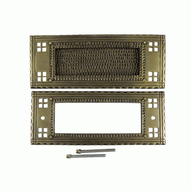 Arts & Crafts Style Mail Slot for Front Doors (Antique Brass) - measures 10 inches wide and 4 inches tall. Comes complete with mounting hardware. This mail slot also has an opening of approximately 6 1/8 inches wide and 2 inches tall. Rear mounts with two bolts (provided).