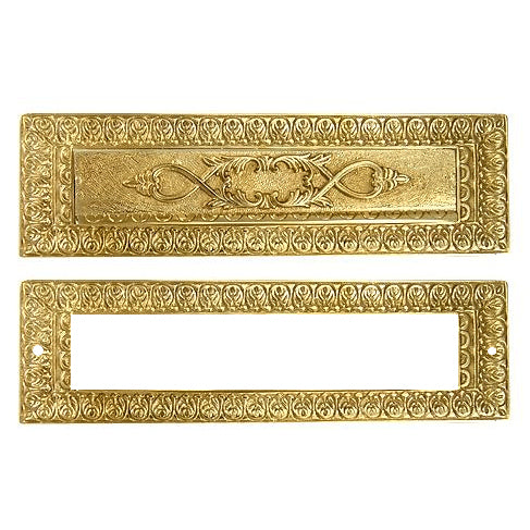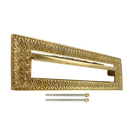 Antique Mail Front Door Slot - Victorian Style (Polished Brass Finish) - measures 9 inches long - with ornate detailing. Solid brass construction and comes complete with the mounting hardware.