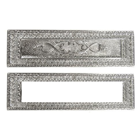 Antique Mail Front Door Slot - Victorian Style (Polished Chrome) - measures 9 inches long - with ornate detailing. Solid brass construction and comes complete with the mounting hardware.