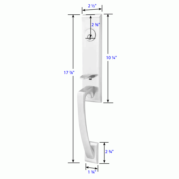 Solid Brass Artemis Style Mortise Entryway Set (Brushed Nickel Finish) - this entryway set measures 2 1/2 inch wide by 17 7/8 inch tall. Various styles of knobs available at no additional charge. Entryway mortise backset comes as 2 1/2 inch standard and a 2 3/4 inch backset is available if required. Entryway set deadbolt to knob center-to-center distance is 5 1/2 inches. The overall grip thickness is 1 inch. The clearance between the door and grip is 2 1/4 inches. The plates have a thickness of 1/2 inch. This is a complete set and it comes with tubular latch mechanisms, strike plates, complete knob sets, internal mechanisms, deadbolts and all mounting hardware.[/description]