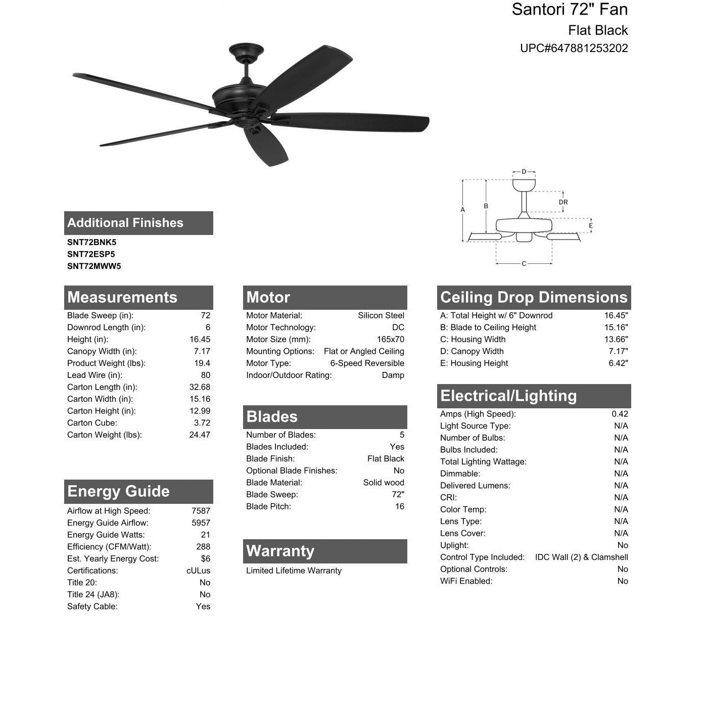 The Craftmade Santori 72" ceiling fan is the perfect combination of excellent performance, exceptional value and timeless style. The Craftmade Santori 60" ceiling fan includes IDC remote and wall controls, energy efficient 6-speed, reversible DC motor, updated straight blade arms and custom blades. Brushed Polished Nickel is for indoor use only. Espresso, Flat Black and Matte White are damp rated for both indoor and outdoor use.