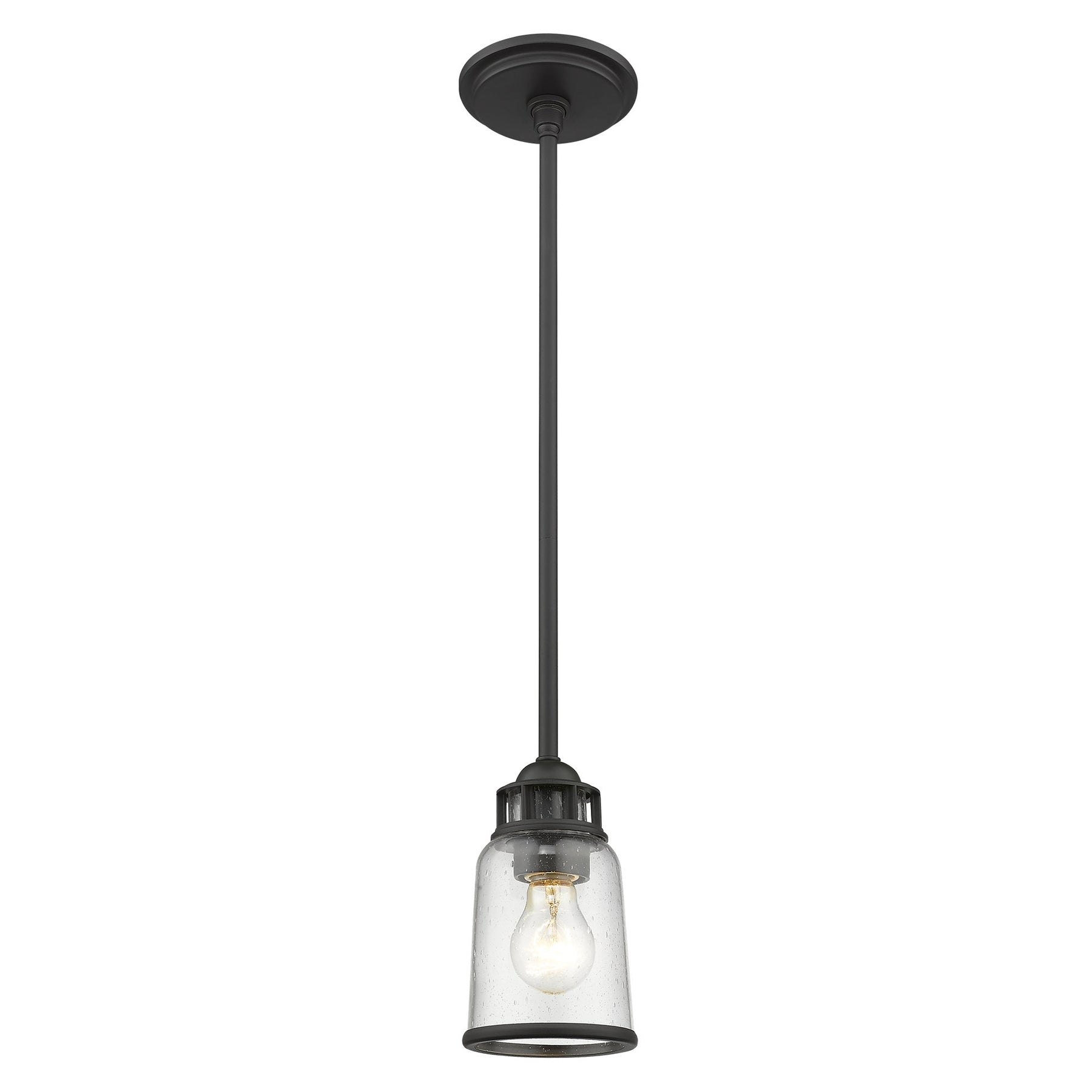 The Lawrenceville Mini Pendant in a classic bronze finish is a beautiful addition to any space, showcasing a retro industrial design reminiscent of 19th-century lighting. This pendant features a hand-blown clear seeded glass shade and measures 15 to 45 inches in height with a 5-inch diameter. It accommodates one medium base bulb with a maximum wattage of 100W (not included) and includes stem sections of 6, 12, and 18 inches for versatile installation. Designed for damp locations, it is suitable for various settings, including areas with humidity, while also accommodating sloped ceilings.
