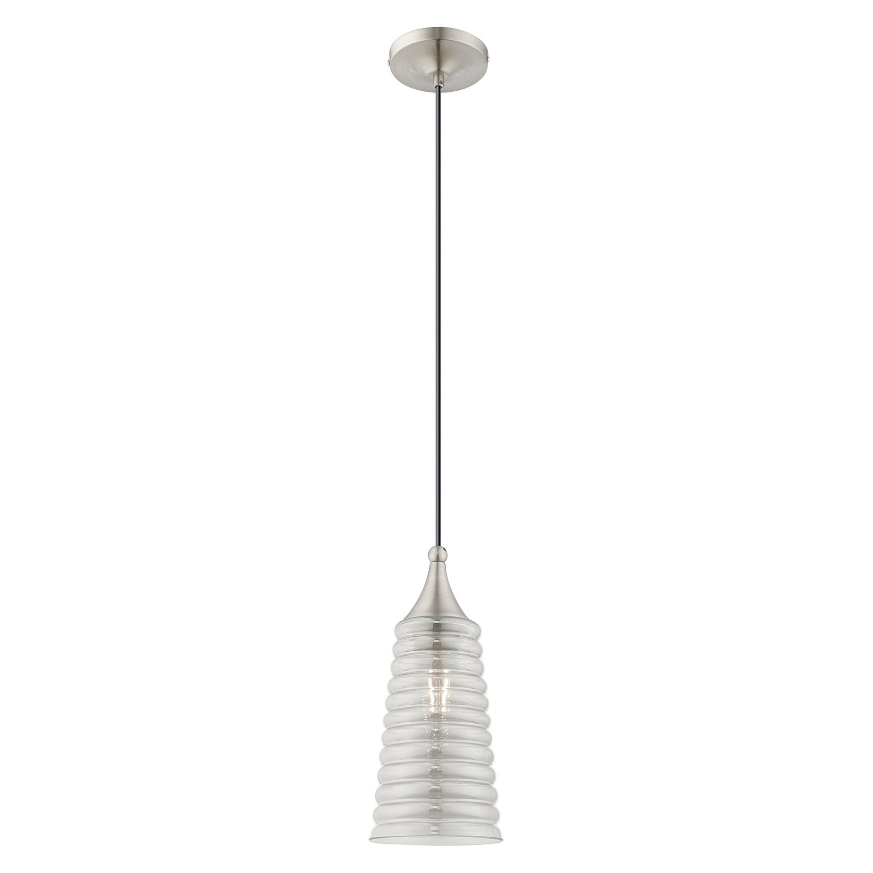 The 40647-91 Art Glass Mini Pendant in Brushed Nickel is a chic and contemporary lighting fixture perfect for adding a touch of elegance to any space. This pendant light features a smoke ribbed glass shade that beautifully refracts light, creating a soft and inviting ambiance. Adjustable in height from 13.5 to 80 inches, it has a diameter of 5.5 inches and is designed to accommodate sloped ceilings. The fixture requires one medium base bulb (not included) with a maximum wattage of 60W. With a 6-foot wire, it is suitable for damp locations, making it an ideal choice for kitchens and dining areas.