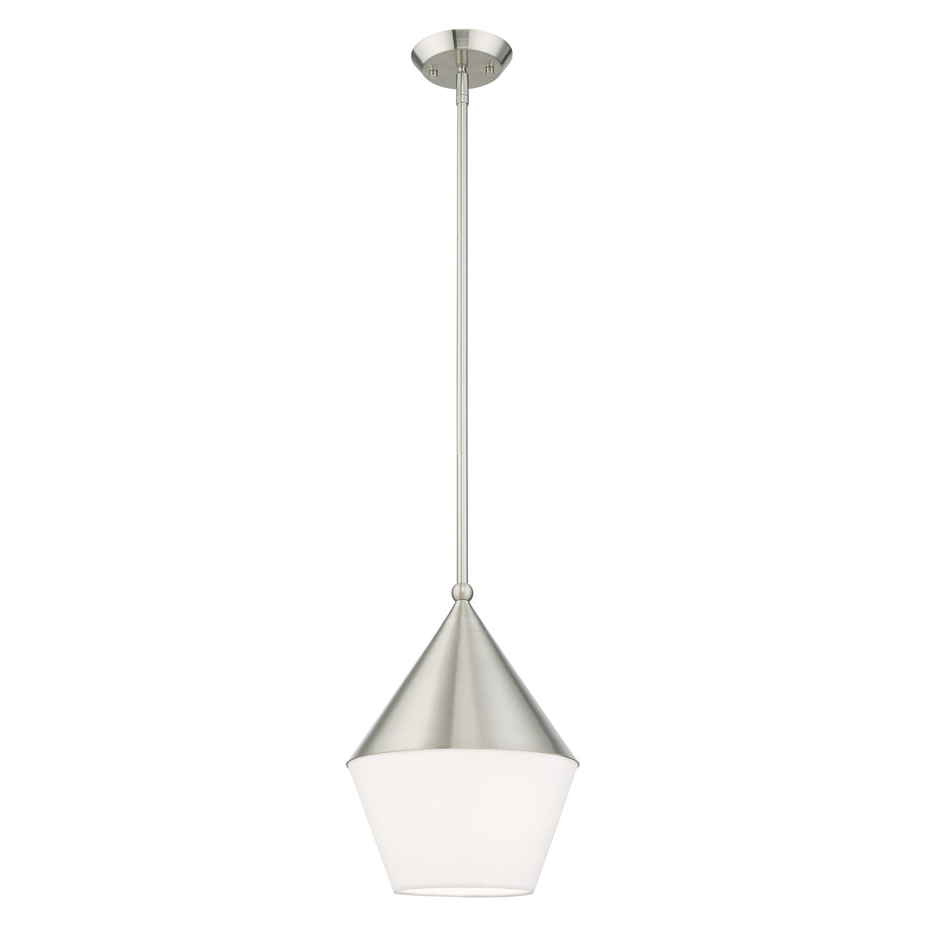 The 40684-91 Stockholm Mini Pendant is a stunning blend of style and functionality, perfect for enhancing your decor. Standing at an adjustable height of 20 to 52 inches and featuring a 10-inch diameter, this fixture showcases a beautiful brushed nickel finish. It is complemented by a hand-crafted off-white hardback shade that not only adds elegance but also houses one medium base bulb with a maximum wattage of 40W (bulb not included). Designed for mid-century modern aesthetics, the pendant includes 8 feet of wire and multiple stem sections (6\