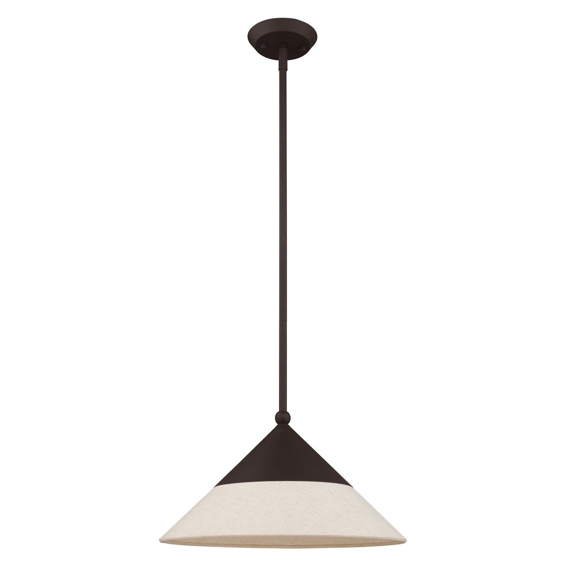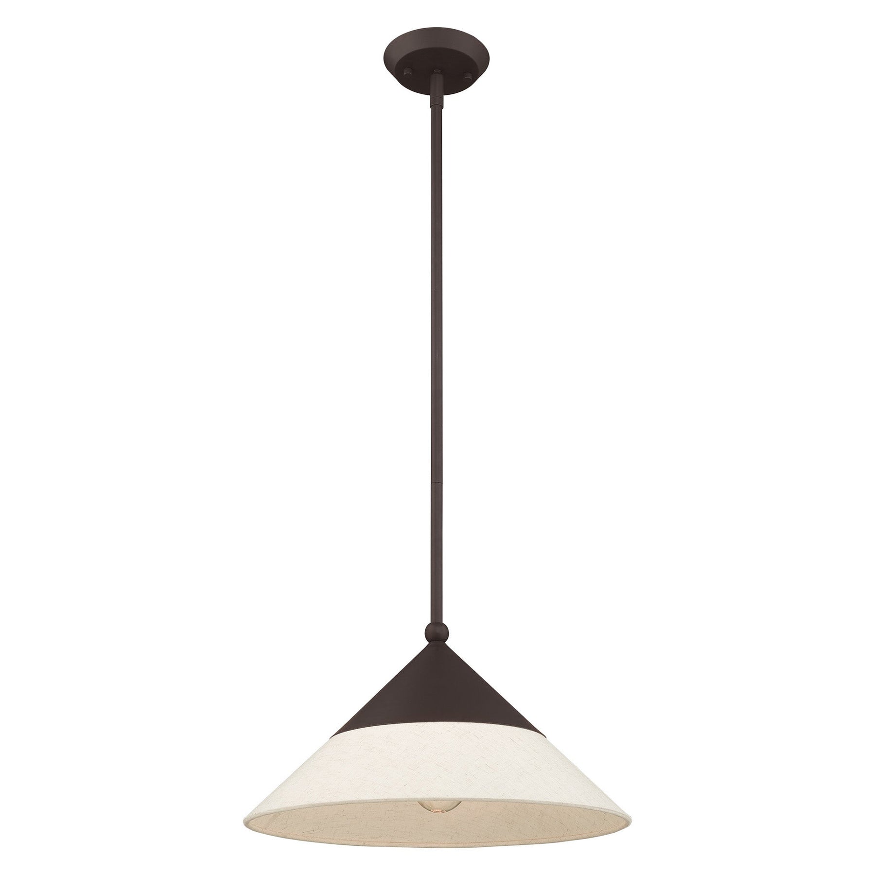 The Stockholm Mini Pendant, item number 40717-07, combines a sleek bronze metal construction with a hand-crafted oatmeal hardback shade, embodying a distinct mid-century modern aesthetic. With a height that adjusts from 16.75 inches to 46.75 inches and a diameter of 15 inches, this fixture is designed to stand out. It accommodates one medium base bulb with a maximum wattage of 40, making it a versatile lighting option. The pendant is suitable for damp locations, offering added flexibility for various installations, including sloped ceilings.