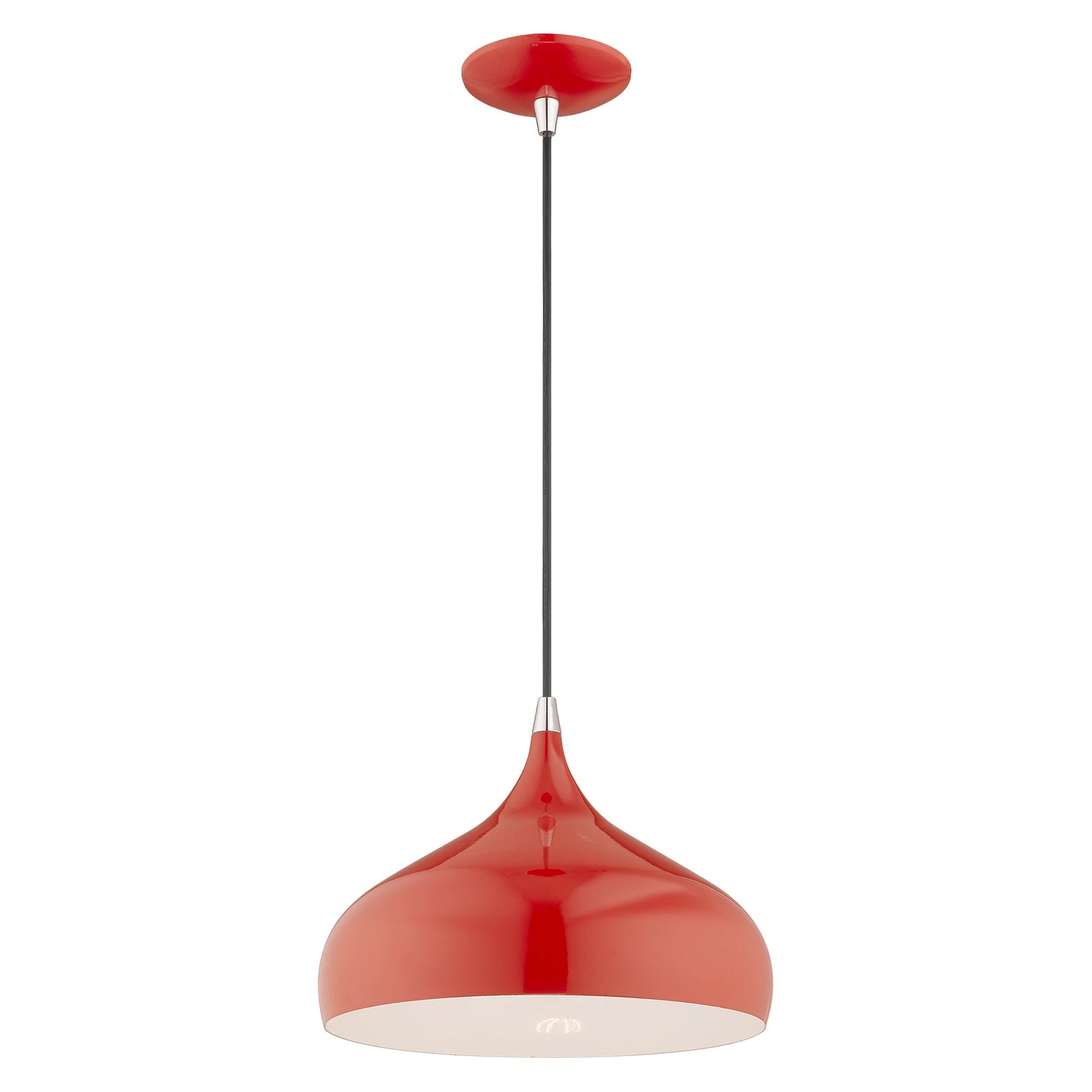 The 41172-72 Amador Pendant light exudes a modern and minimal aesthetic with its striking shiny red metal shade, complemented by a shiny white finish inside. This versatile fixture measures 15 inches in height (adjustable up to 75 inches) and features a diameter of 11.75 inches. It accommodates one medium base bulb (not included) with a maximum wattage of 60W, and is suitable for damp locations, making it ideal for various environments. Additionally, the pendant includes a 6-foot wire for ease of installation and adapts seamlessly to sloped ceilings.
