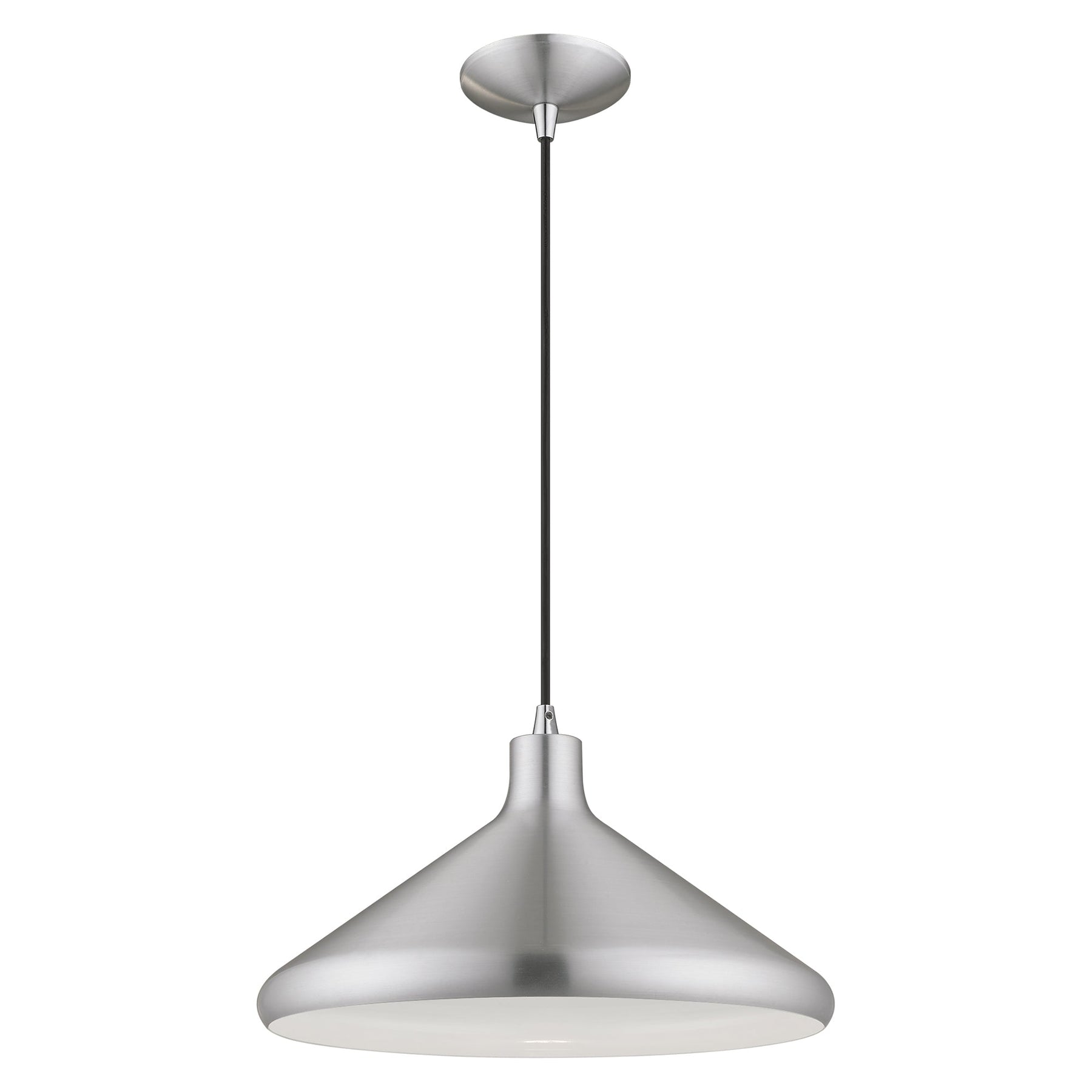 The 41179-66 Mini Pendant light fixture is a perfect blend of retro flair and modern sensibility, making it an excellent choice for eclectic spaces. This pendant features a brushed aluminum metal shade with a shiny white finish inside, producing a striking visual effect. It measures 14 inches to 75 inches in height, with a 15.25-inch diameter shade, and includes a 6-foot wire for versatile installation. Designed for a medium base bulb with a maximum wattage of 60W, this fixture is also suitable for damp locations, allowing you to brighten up interiors in a stylish and practical way.
