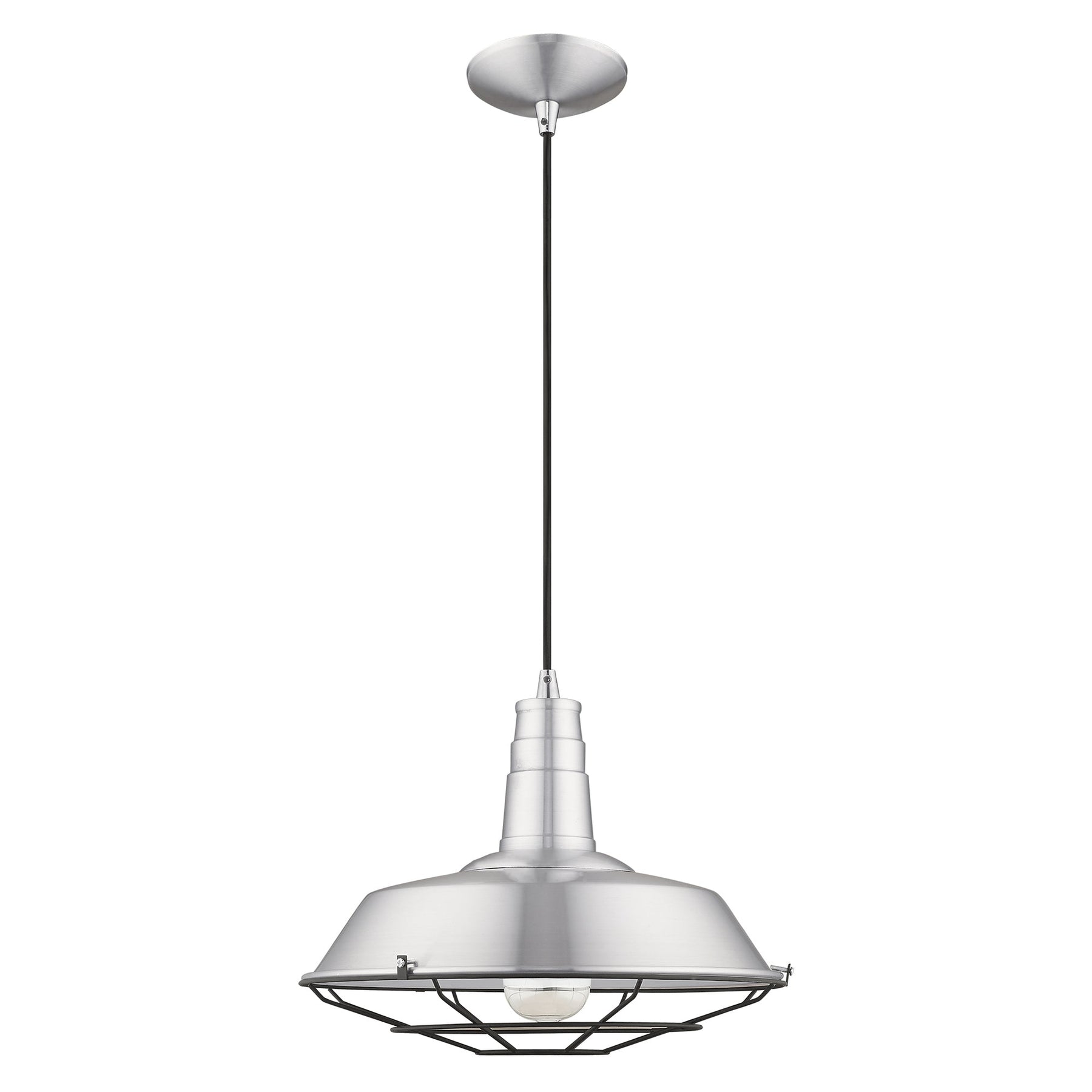 The 41184-66 Mini Pendant with a brushed aluminum metal shade features a distinctive caged design that brings an antique charm to modern decor. With a height adjustable from 16 to 75 inches and a diameter of 14 inches, this pendant is versatile and fits well in urban settings. It requires one medium base bulb with a maximum wattage of 60W (not included). The stylish white interior enhances the light output, and it is suitable for damp locations, making it ideal for kitchens and covered outdoor areas. The pendant also includes polished chrome finish accents, adding a touch of elegance.