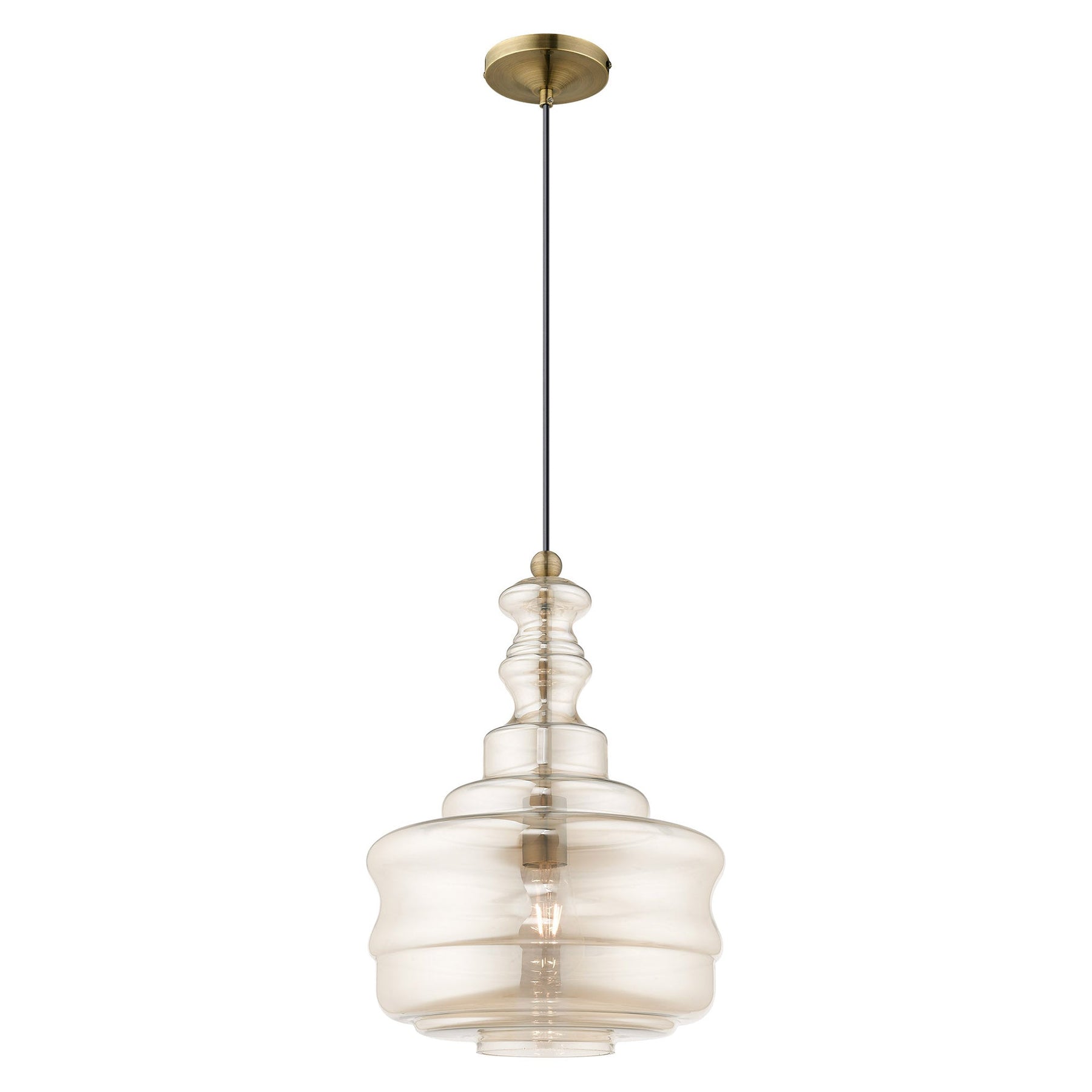 The 41225-01 Art Glass Mini Pendant is a stunning addition to any home, blending timeless elegance with modern sensibilities. This fixture features a hand-blown champagne glass shade and an antique brass finish, perfect for creating a sophisticated atmosphere. Measuring 19.25 to 90 inches in height and 12.625 inches in diameter, it accommodates sloped ceilings and provides versatility in installation. Designed for one medium base bulb (not included) with a maximum wattage of 60W, this mini pendant is UL listed for damp locations, making it suitable for various settings.