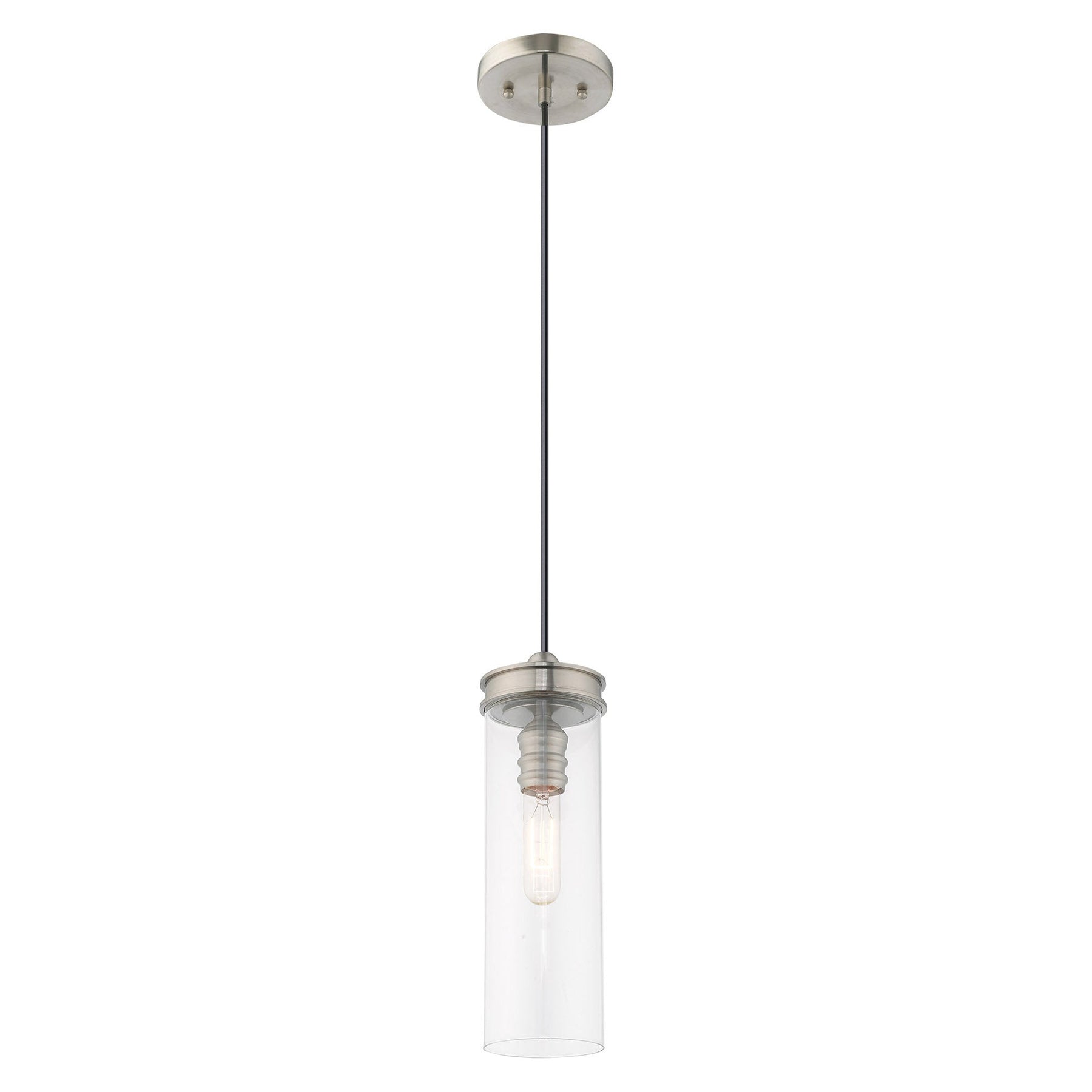 The 41236-91 Art Glass Mini Pendant combines a modern aesthetic with industrial-chic design, making it an ideal addition to any transitional space. Measuring 15 inches to 90 inches in height and boasting a sleek diameter of 5.125 inches, this pendant features a stylish clear glass shade suspended by brushed nickel hardware. It requires one medium base bulb (not included) with a maximum wattage of 60W and includes an 8-foot wire for versatile hanging options. Designed for damp locations, it's a perfect lighting solution for various indoor environments, even those with sloped ceilings.