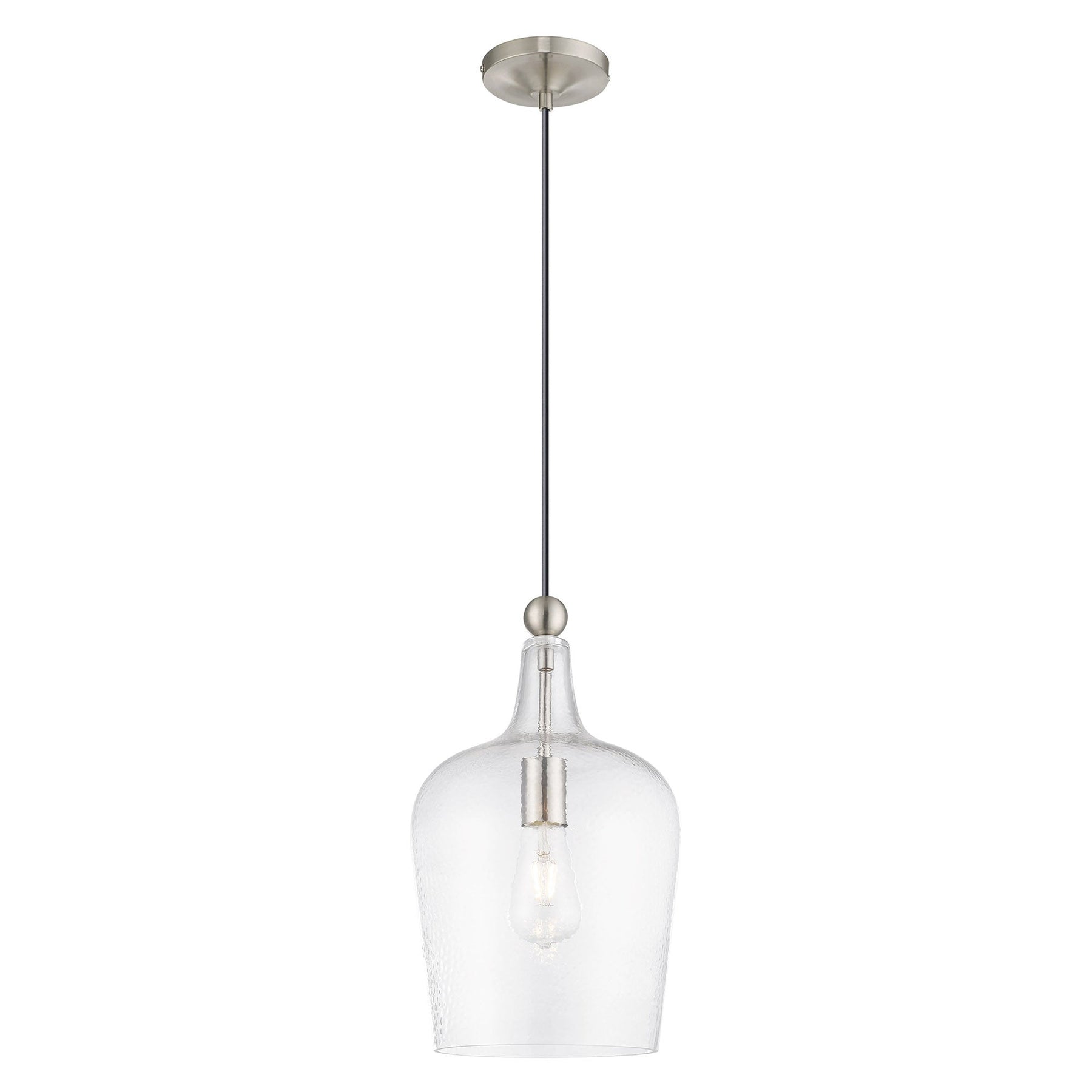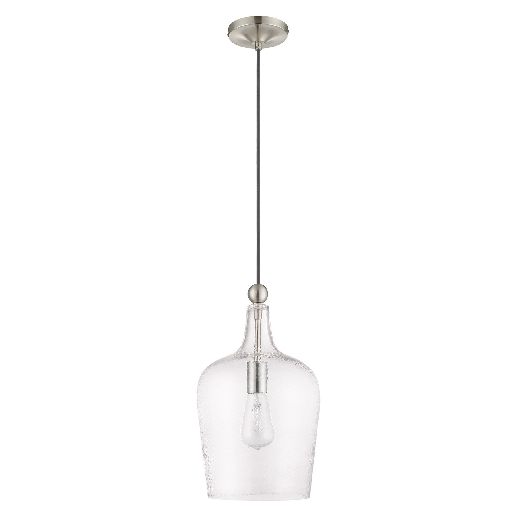 The 41237-91 Art Glass Mini Pendant combines a sleek brushed nickel finish with a graceful carafe-shaped clear glass shade, making it a perfect enhancement for kitchens, bars, and hallways. It features an adjustable height ranging from 18.5 inches to 90 inches, a diameter of 9.25 inches, and is designed to accommodate sloped ceilings. This pendant light requires one medium base bulb (not included) with a maximum wattage of 60W, and its 8-foot wire allows versatile installation options. Furthermore, it is suitable for damp locations, adding both style and functionality to your space.