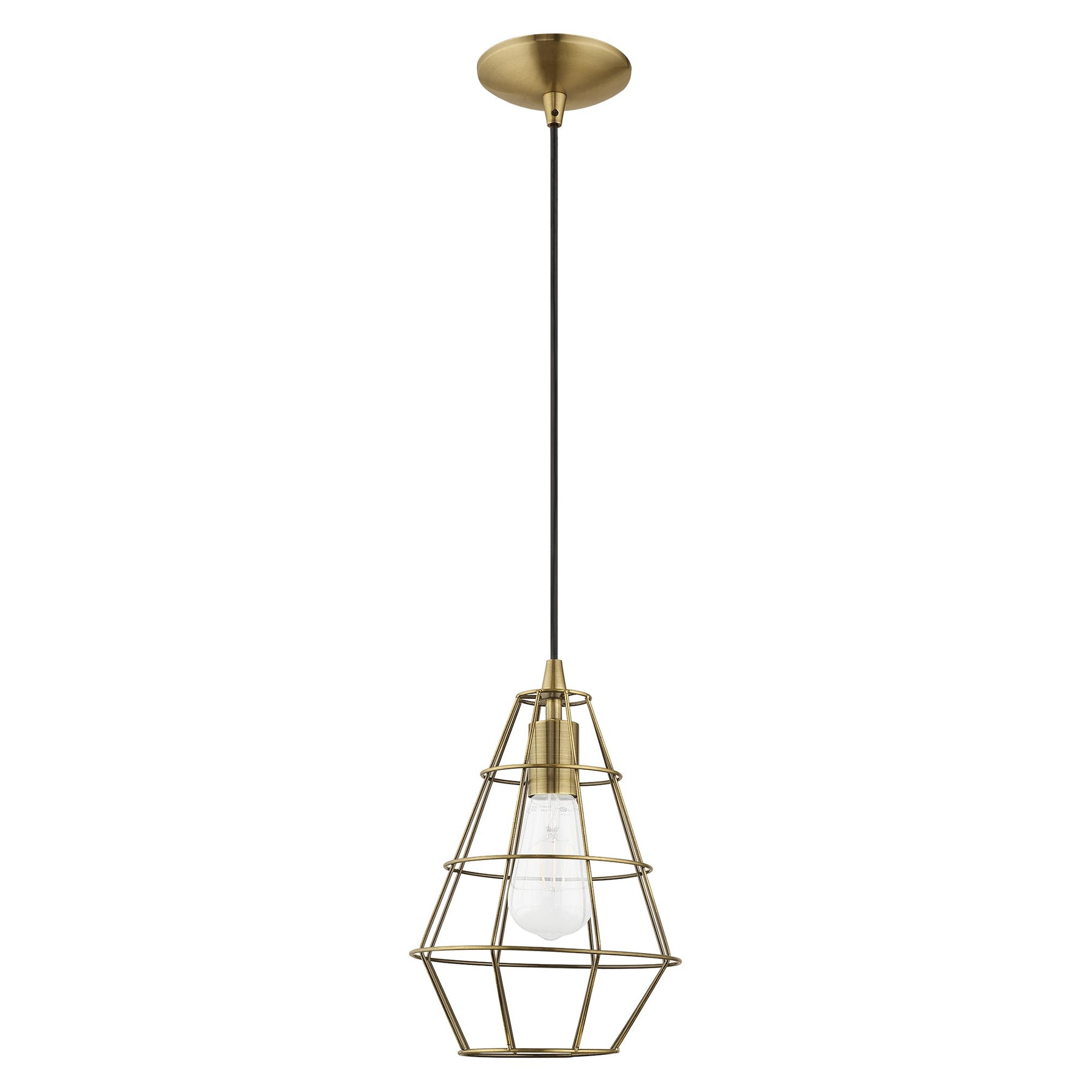 The 41322-01 Bedford Mini Pendant light fixture offers a contemporary and urban flair, perfect for modern interiors. Suspended from a simple black cord, it features an antique brass finish over the rugged steel cage, evoking a stylish industrial charm. With an adjustable height ranging from 15 inches to 75 inches and a diameter of 7.75 inches, it accommodates sloped ceilings and provides versatility in placement. This fixture requires one medium base bulb (not included) with a maximum wattage of 60W. It is suitable for damp locations, making it an excellent choice for various settings.