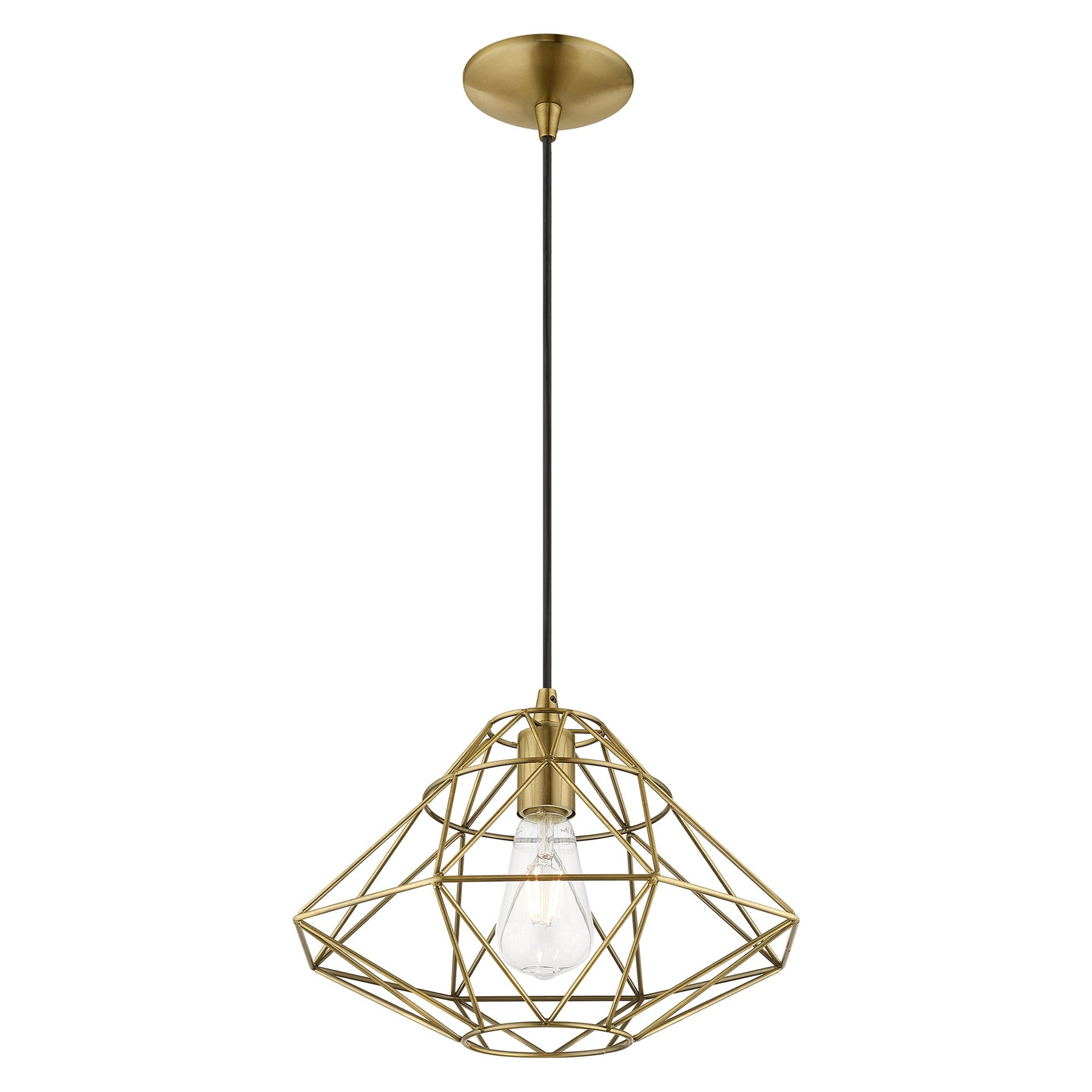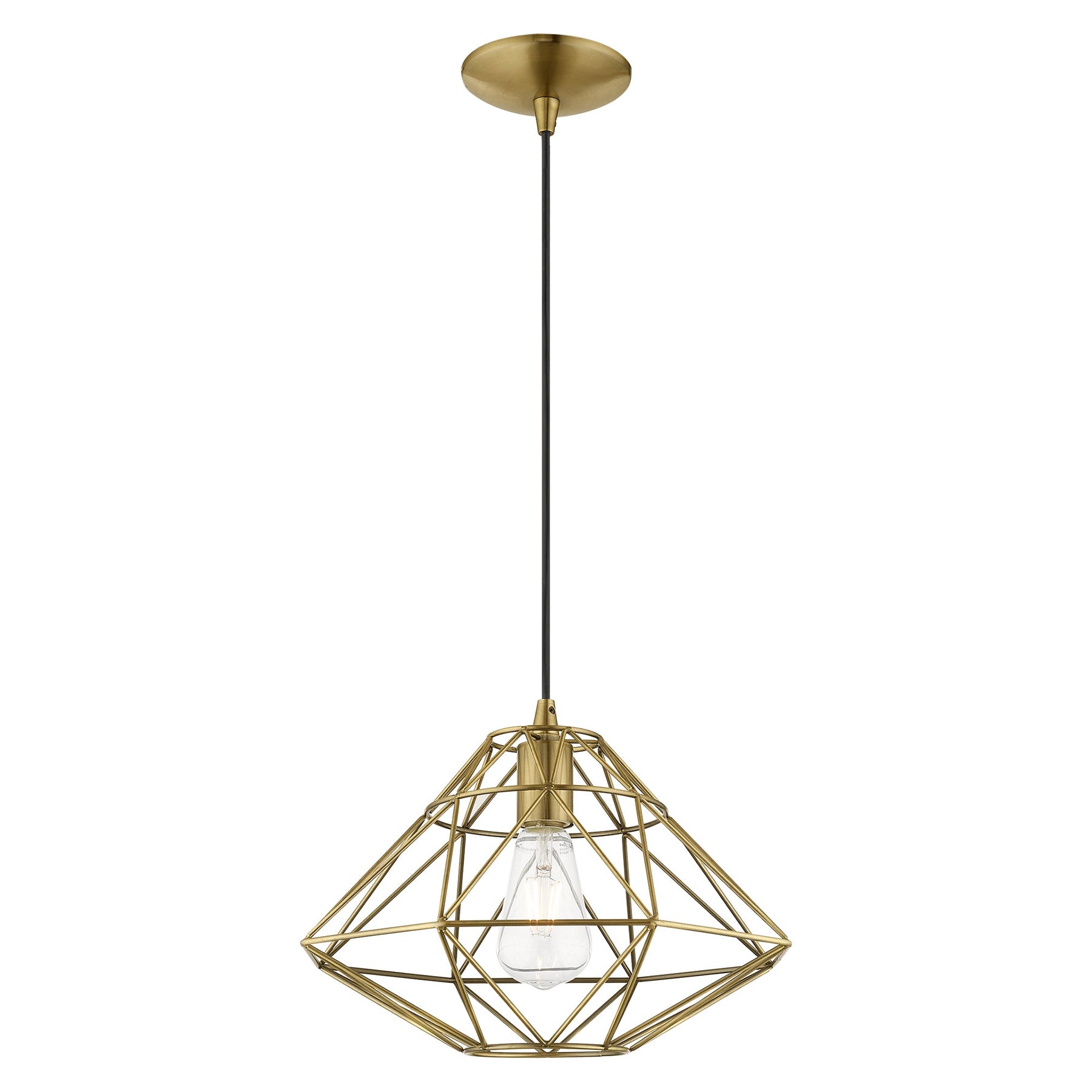 The Knox Mini Pendant (Item number: 41323-01) boasts a contemporary design with its antique brass geometric metal shade, measuring 13.5 inches in diameter and adjustable from 13 to 75 inches in height. Designed for a single medium base bulb with a maximum wattage of 60, this fixture is perfect for adding a modern accent over countertops or dining areas. With a 5-inch canopy, it is suitable for damp locations but not for wet environments, making it ideal for various settings while accommodating sloped ceilings effortlessly.