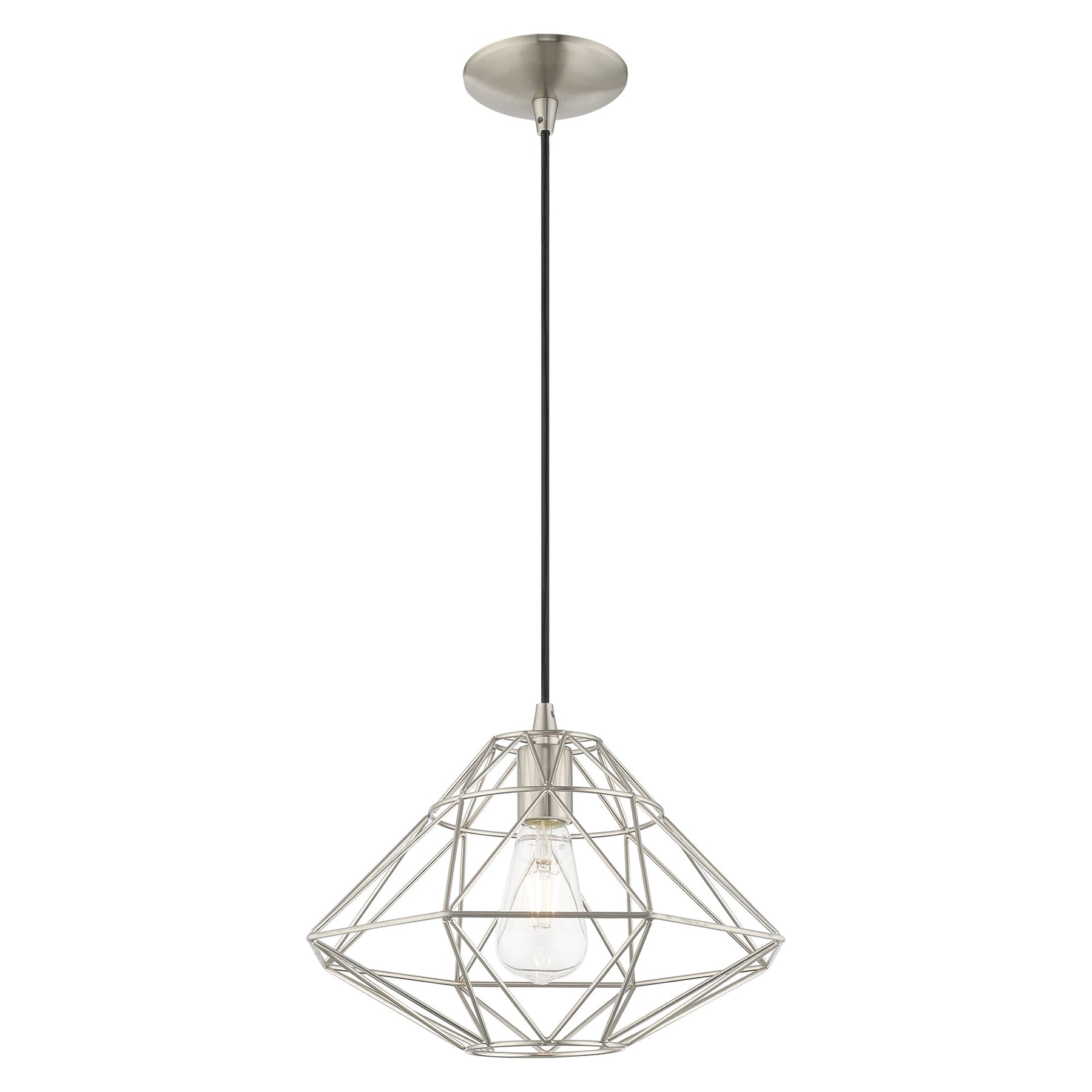 The Knox Mini Pendant (Item number: 41323-91) is a stylish addition to contemporary spaces, featuring a brushed nickel geometric metal shade that beautifully complements any decor. With a height adjustable from 13 inches to 75 inches and a diameter of 13.5 inches, this pendant is versatile enough for various settings. It accommodates a single medium base bulb with a maximum wattage of 60W (bulb not included) and is suitable for damp locations, making it ideal for kitchens or dining areas. The 6-foot wire length provides flexible installation options, while its angular design adds a modern touch to any room.