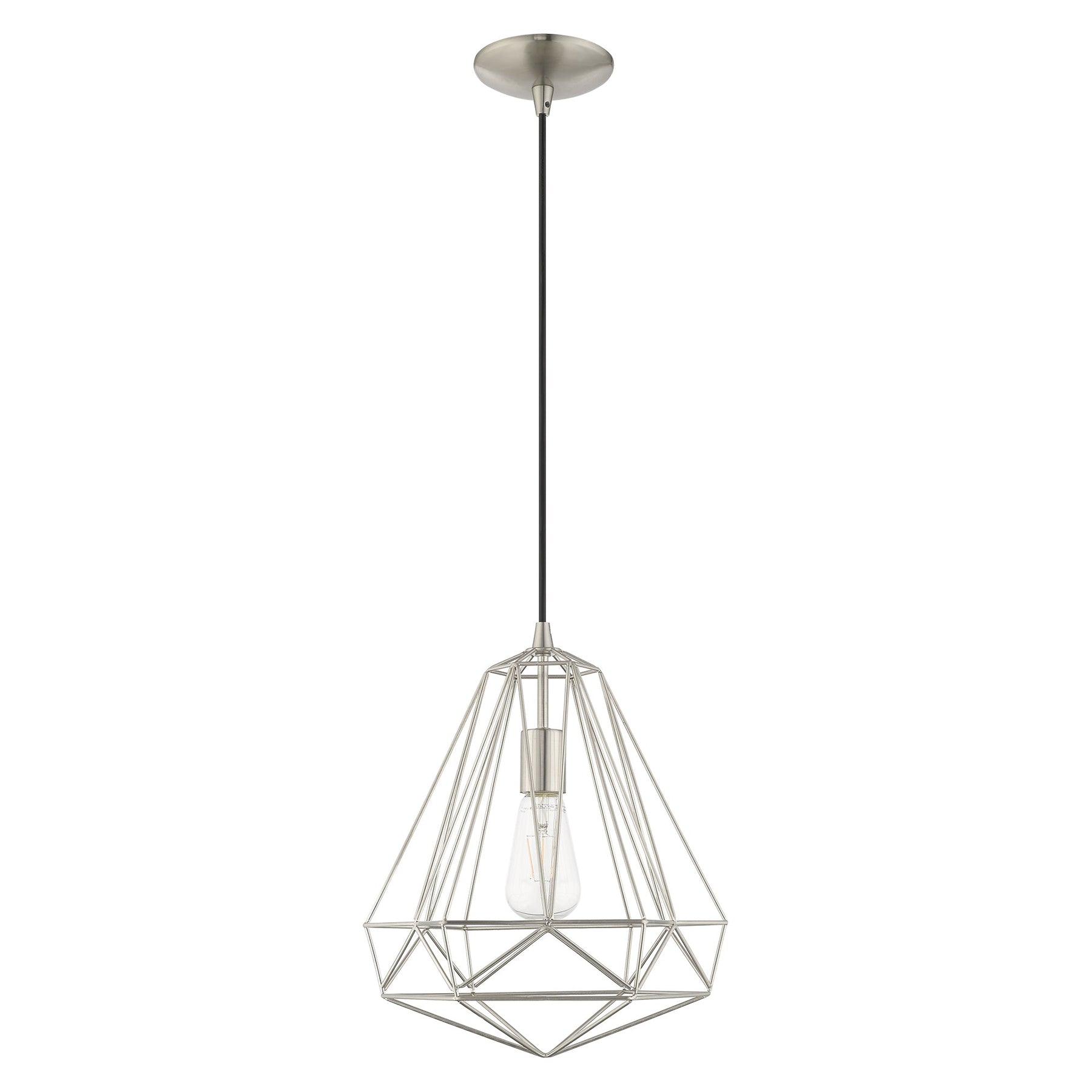 The 41324-91 Knox Mini Pendant is a striking lighting feature that combines contemporary design with functionality. It has a height adjustable range from 18 inches to 80 inches and a diameter of 12.25 inches, making it versatile for various spaces. The brushed nickel geometric metal shade not only enhances its modern aesthetic but is also suitable for damp locations. This pendant requires a single medium base bulb with a maximum wattage of 60W (bulb not included) and comes with a 6-foot wire, allowing for easy installation in various settings, including those with sloped ceilings.