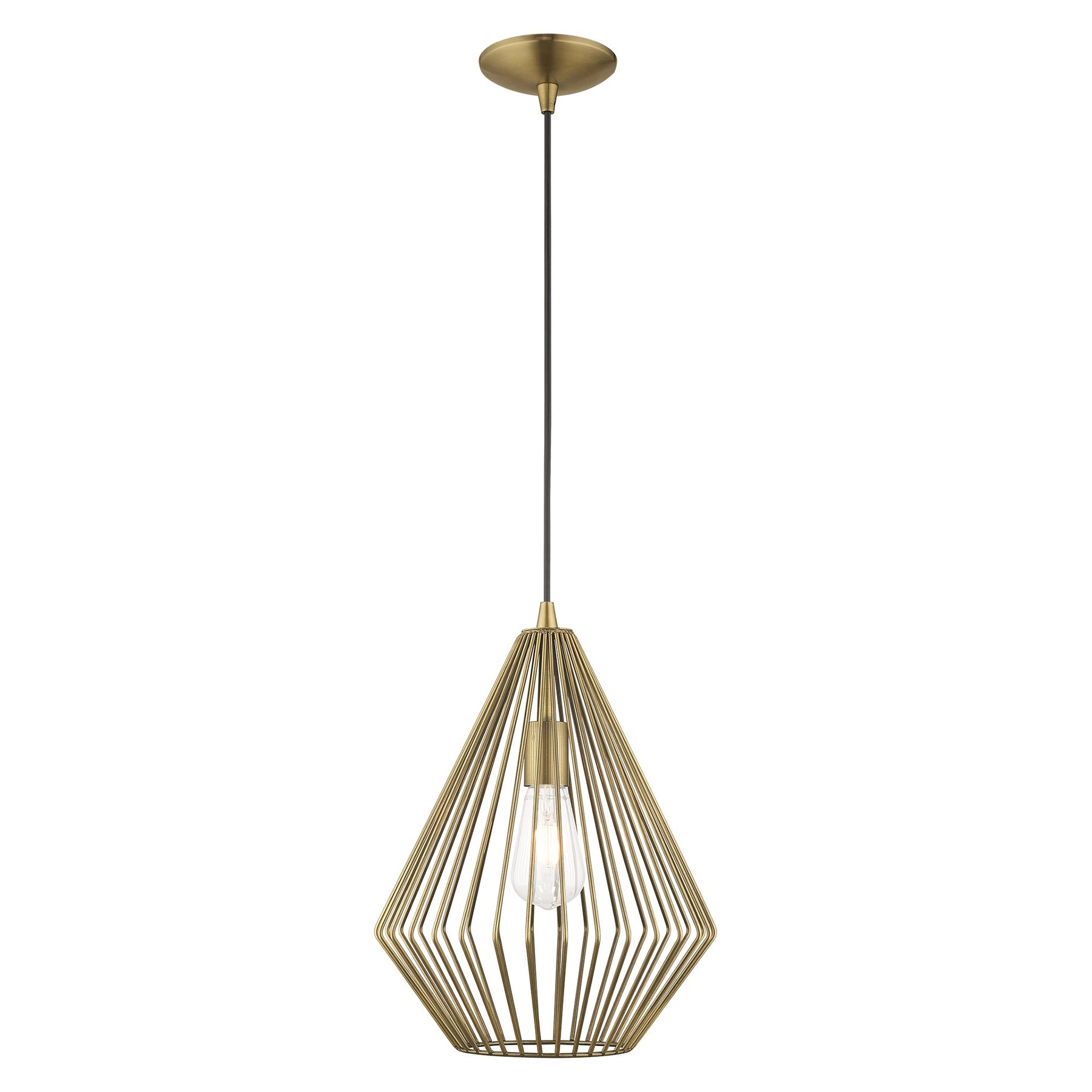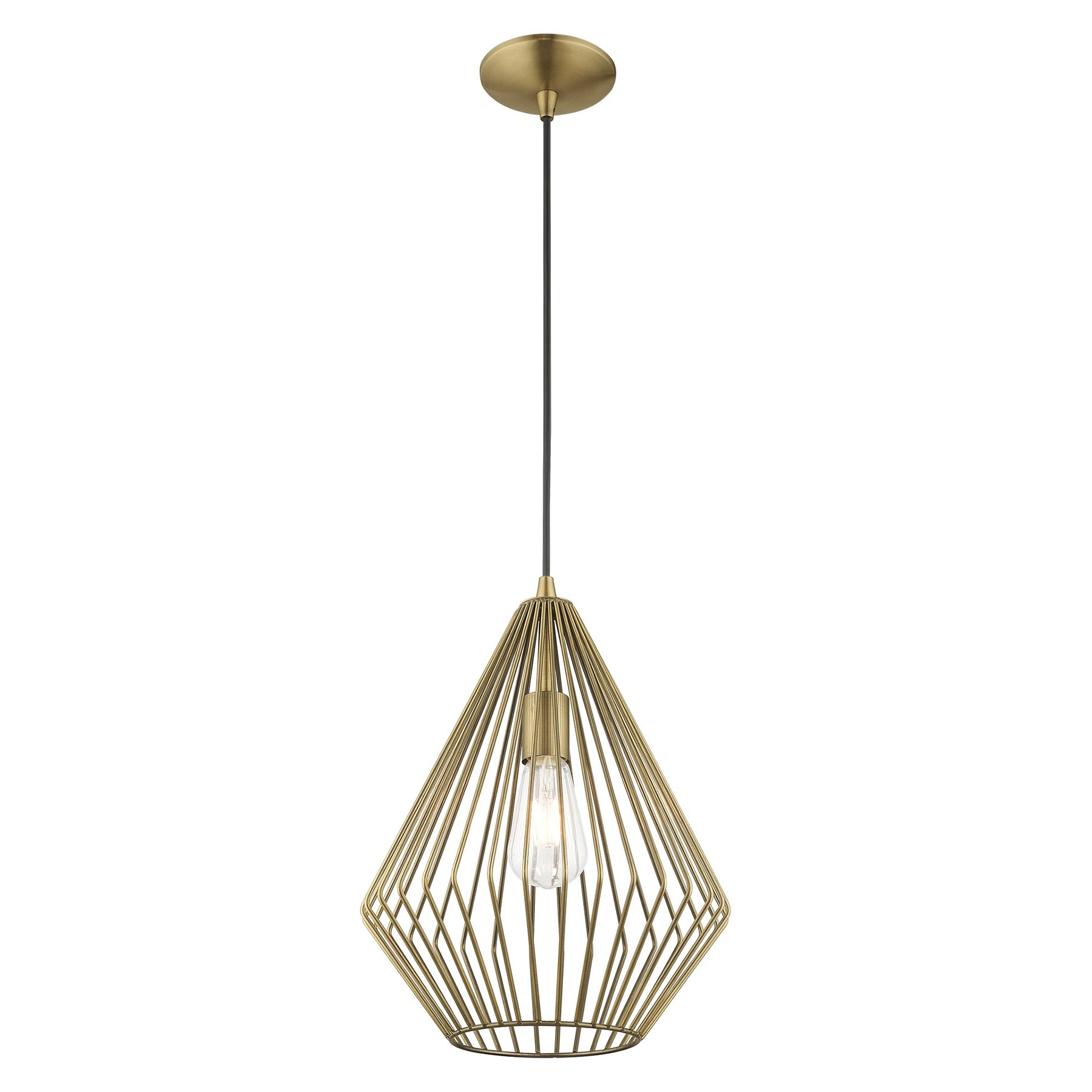 The 41325-01 Linz Mini Pendant in antique brass is a striking addition to contemporary home décor. With an adjustable height ranging from 17.5 inches to 80 inches and a diameter of 11.5 inches, this fixture is designed to illuminate spaces such as dining rooms and kitchen islands. It features a unique geometric metal shade that enhances light diffusion while accommodating one medium base bulb with a maximum wattage of 60W (bulb not included). Constructed from durable steel, the fixture is suitable for damp locations, making it versatile for various settings.
