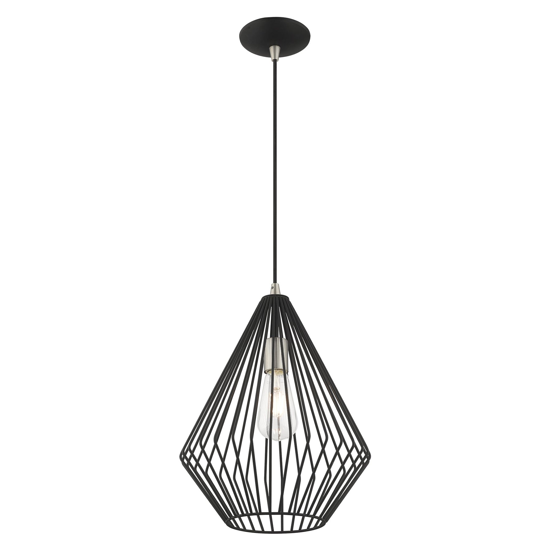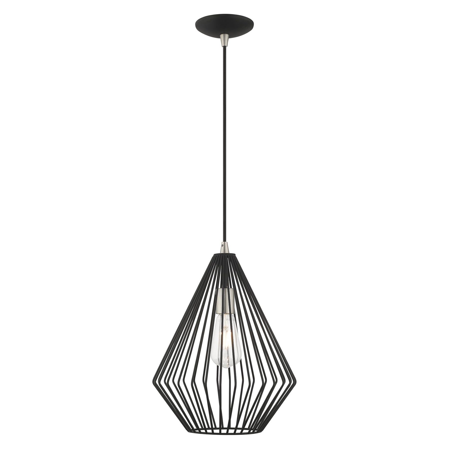 The Linz Mini Pendant 41325-04 in Black offers a striking addition to any modern home decor with its Mid Century Modern style. This pendant features a unique black geometric metal shade that beautifully diffuses light, making it perfect for illuminating dining room tables or kitchen islands. Adjustable in height from 17.5 inches to 80 inches, it accommodates various ceiling types and is suitable for damp locations. The pendant requires one medium base bulb with a maximum wattage of 60W (bulb not included) and includes a 6-foot wire for simple installation.