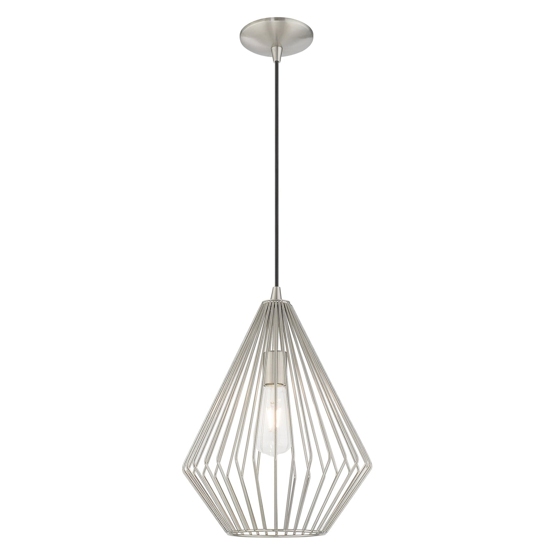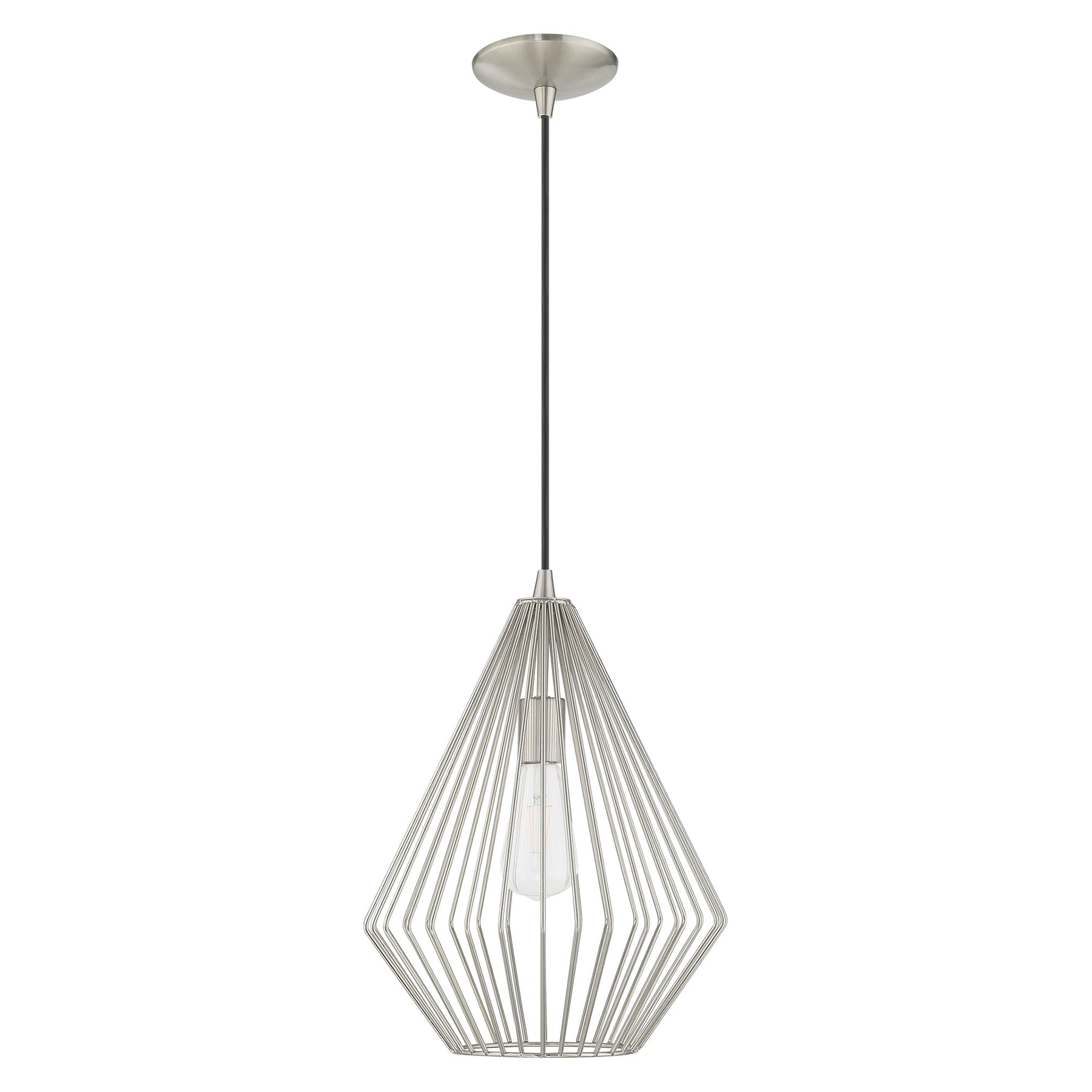 The 41325-91 Linz Mini Pendant is a spectacular addition to any modern home, featuring a height adjustment range of 17.5 inches to 80 inches and a striking 11.5-inch diameter. This pendant light is crafted from durable steel with a stylish brushed nickel finish and a geometric metal shade that enhances the flow of light, perfect for illuminating dining tables or kitchen islands. It accommodates one medium base bulb (not included) with a maximum wattage of 60W, and comes with a 6-foot wire for installation versatility. The fixture is suitable for damp locations, making it an ideal choice for various settings while adding a touch of mid-century modern elegance.