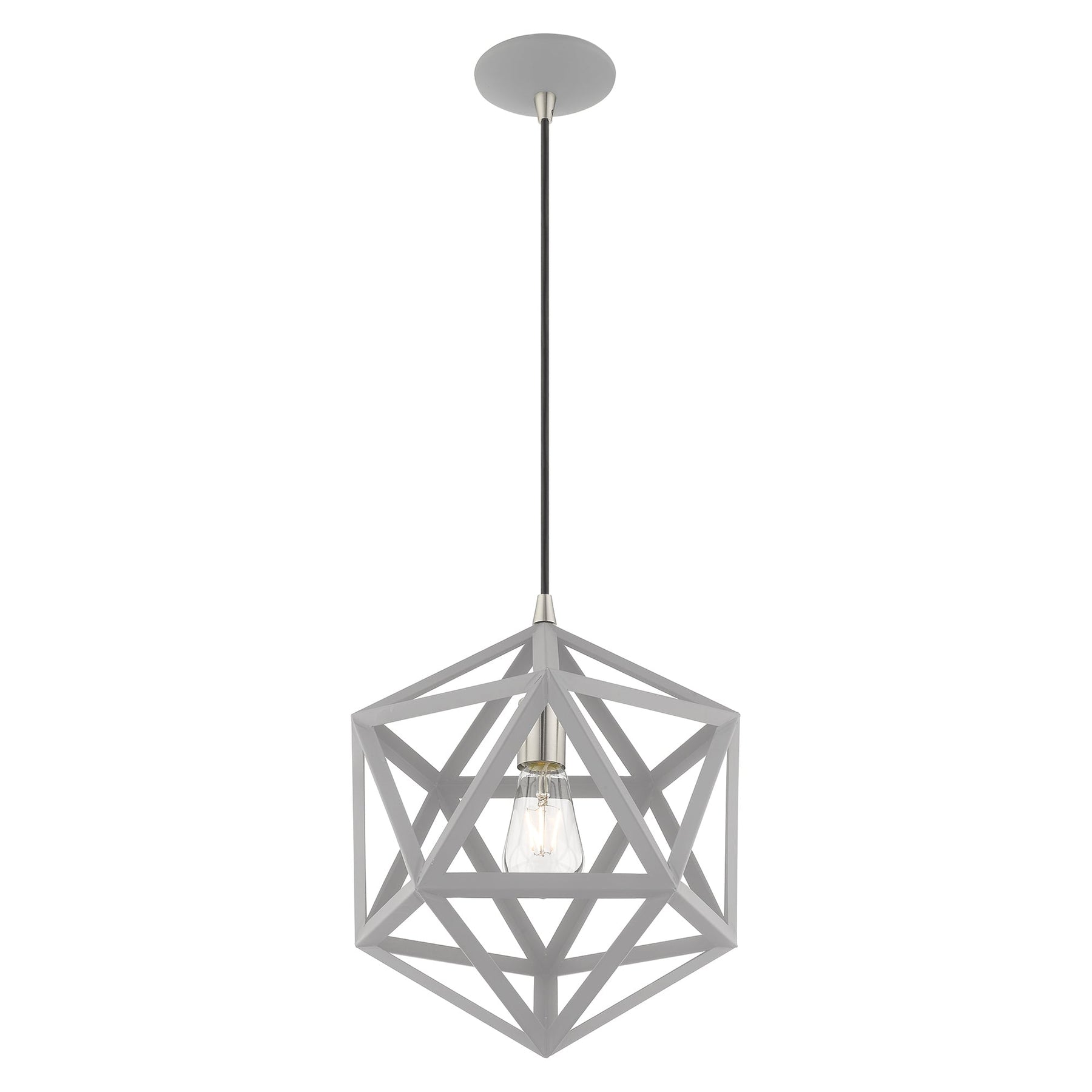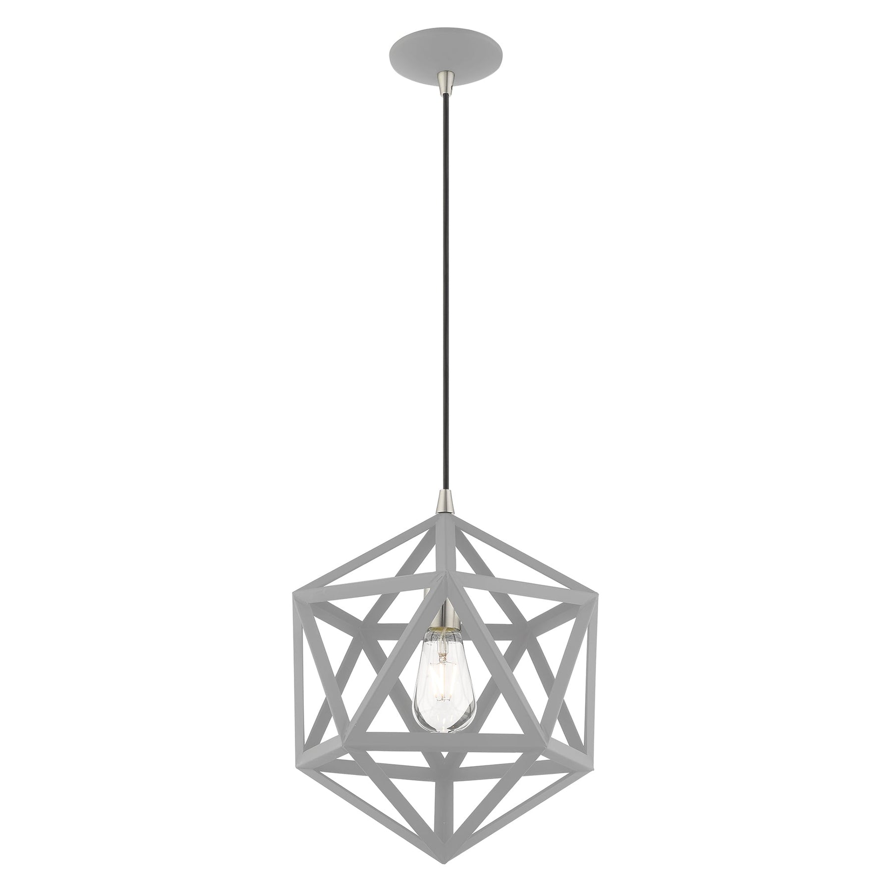 The Ashland Mini Pendant, identified by item number 41328-80, is a striking contemporary lighting fixture that adds a modern touch to any space. Measuring 21 inches to 80 inches in height and 13 inches in diameter, this pendant is designed with a Nordic Gray geometric metal shade and features brushed nickel finish accents. It accommodates one medium base bulb with a maximum wattage of 60W (bulb not included) and is suitable for damp locations, making it ideal for various environments. With a 6-foot wire length, this mini pendant can be easily adjusted to fit your ceiling height, providing versatility while enhancing your decor.