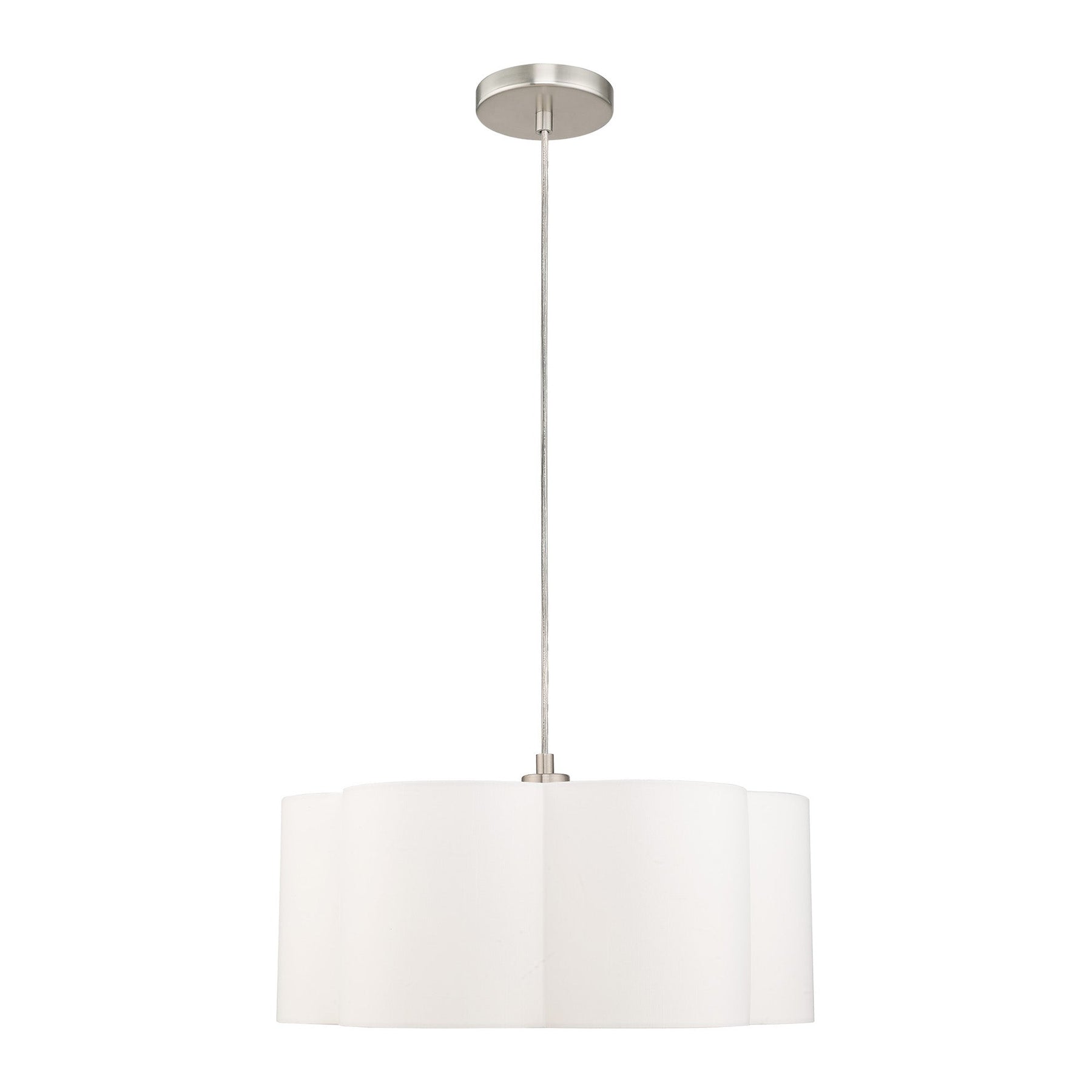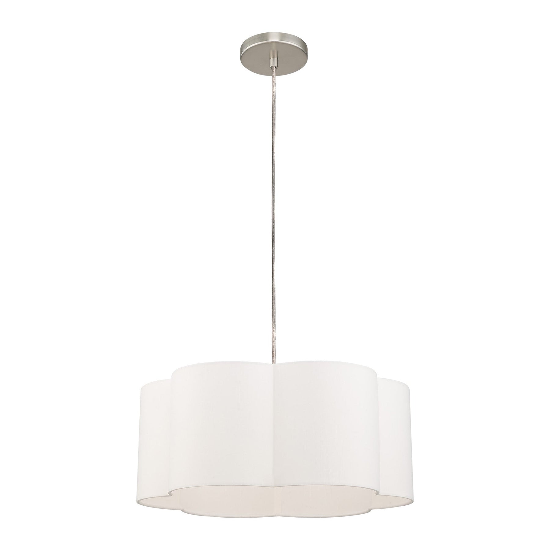 The Chelsea one light pendant 52155-91 is a stunning lighting solution featuring a beautifully handcrafted, off-white fabric hardback shade supported by a sleek brushed nickel frame. With an adjustable height ranging from 16 inches to 80 inches and a diameter of 18 inches, this pendant offers versatility for any space. Designed to accommodate one medium base bulb with a maximum wattage of 100W, it is suitable for damp locations, making it an excellent choice for kitchens or dining areas. The open bottom design allows for easy bulb replacement, while its transitional style seamlessly blends traditional and contemporary décor.