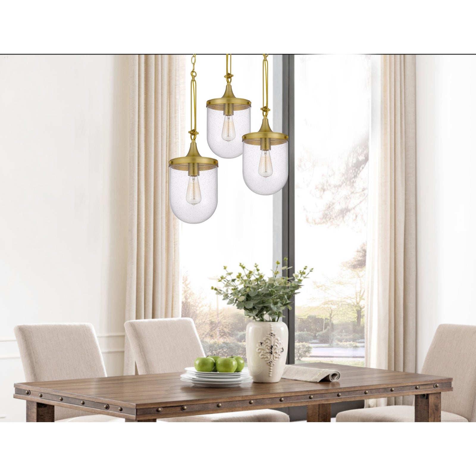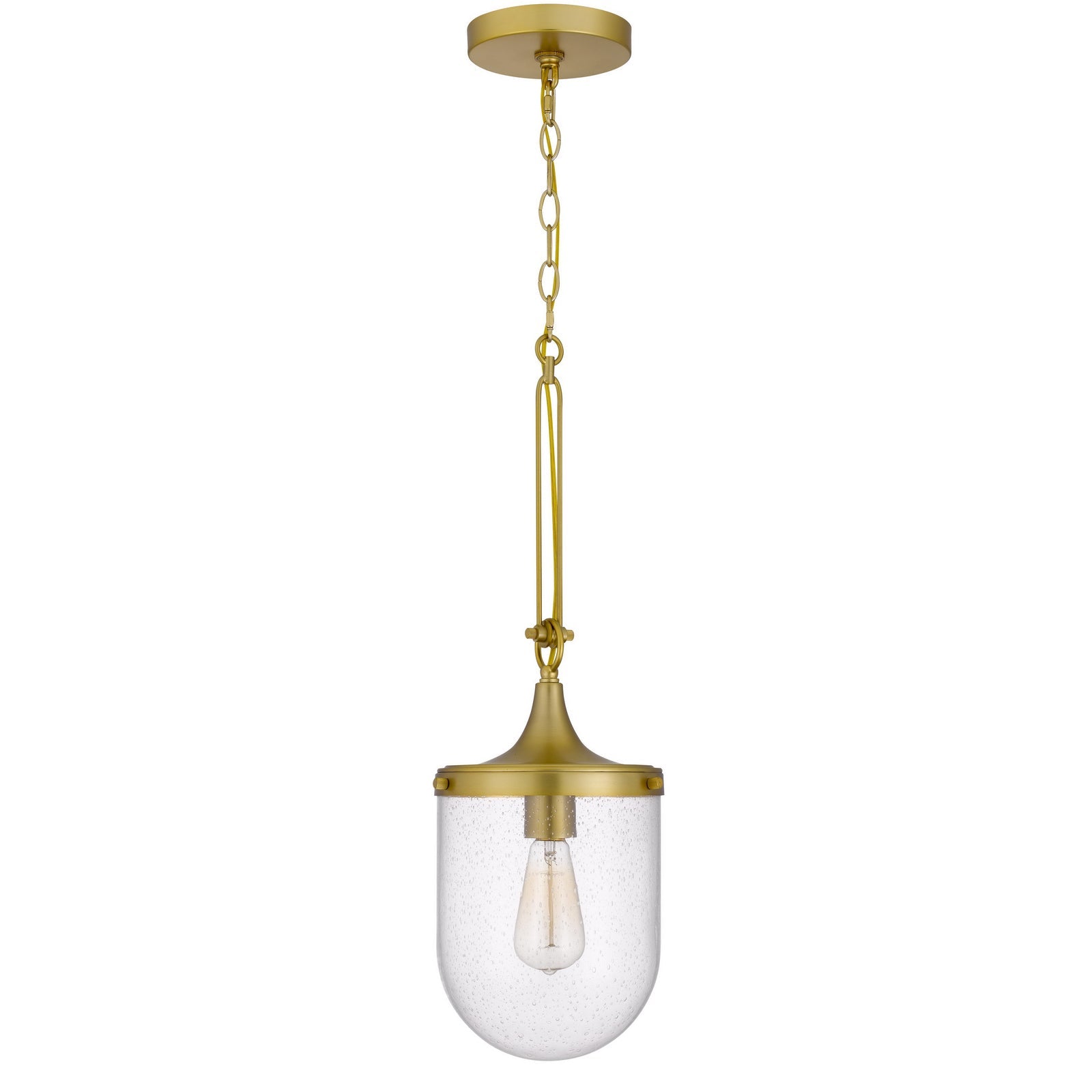 The FX-3785-1 Ithaca Bubbled Glass Pendant Fixture is a stunning addition for those looking to enhance their space with elegance. Featuring a durable metal and glass construction, this pendant light boasts an antique brass finish and a stylish seeded glass shade. It operates with one E26 base bulb (not included) with a maximum wattage of 60W. The fixture comes with a six-foot chain that can be adjusted to your desired length, making it versatile for various ceiling heights. This beautiful light fixture ships in one carton and is easy to assemble, with a lead time of just three business days. Backed by a one-year warranty, it ensures peace of mind without compromising on style.