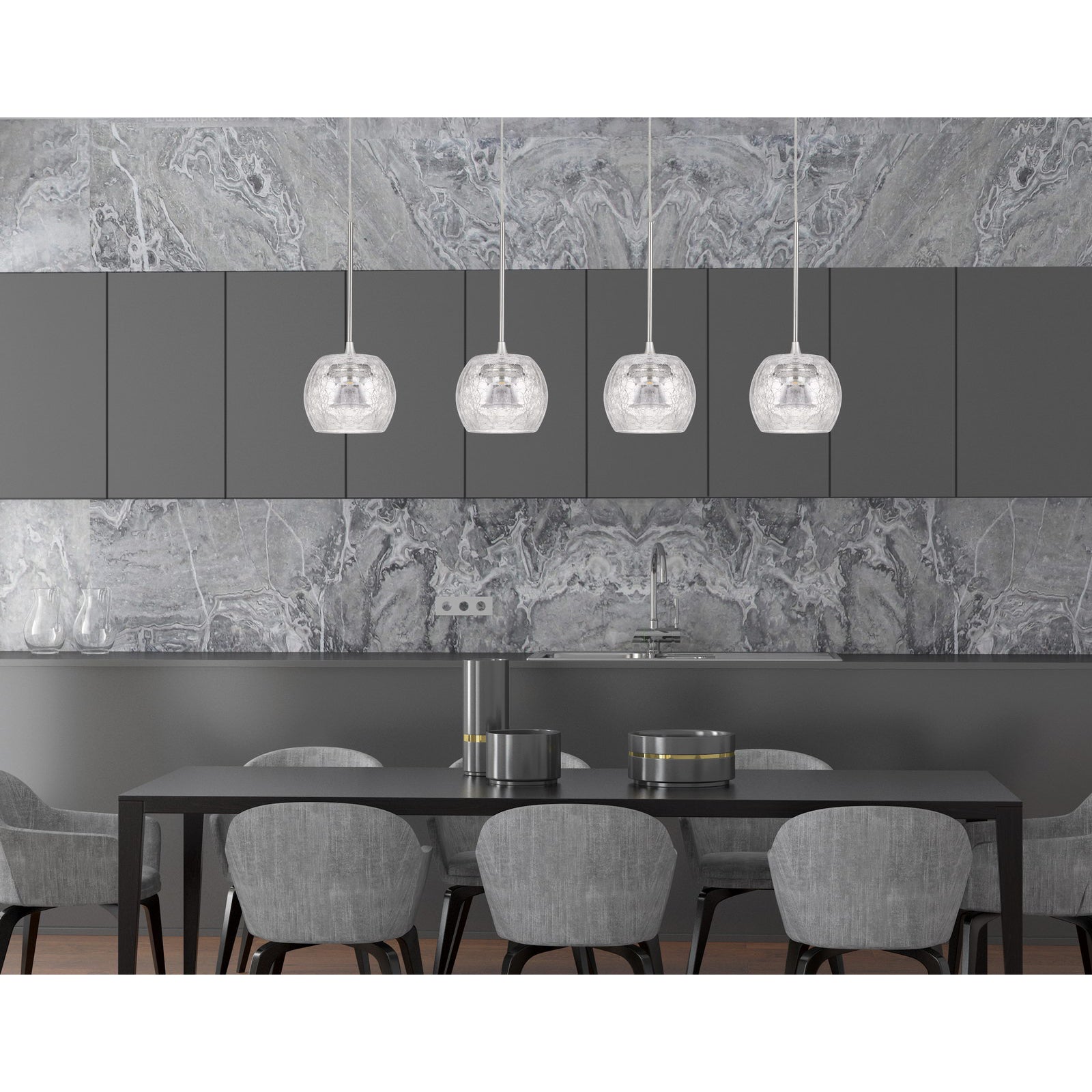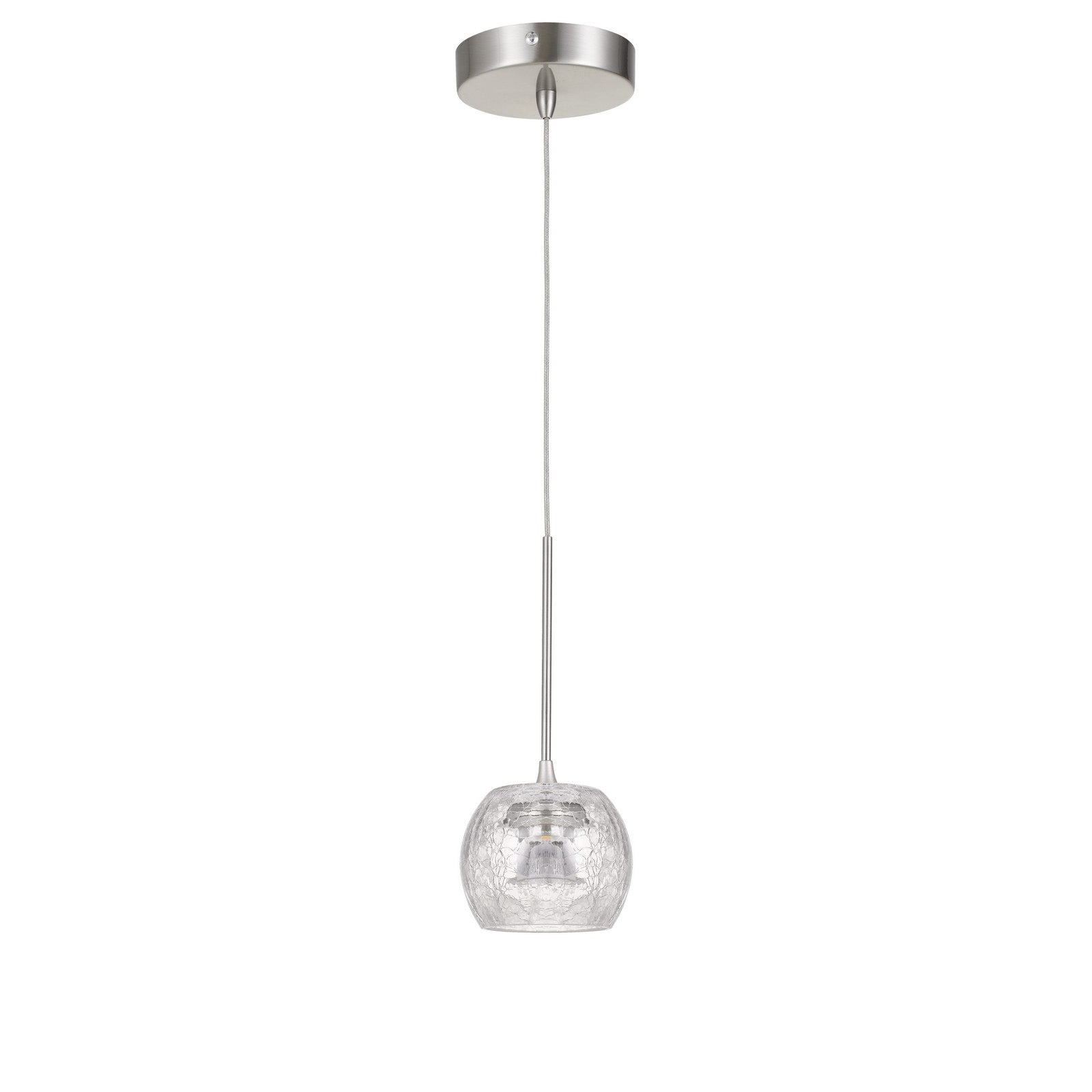 The Ithaca Mini Pendant from product No. UP-1122 is a stylish and functional lighting option featuring a striking clear crackle glass design. This dimmable LED pendant boasts a light temperature of 3000K with a high lumen output of 600, providing bright illumination while maintaining a 90 CRI for true color rendering. Crafted from durable metal and glass, it stands 10 inches tall and includes a 5-inch canopy for easy installation. It is compatible with Lutron dimmers, such as DVCL-153P and others, allowing for customizable lighting ambiance. With a one-year warranty, this pendant is an excellent choice for enhancing any space.