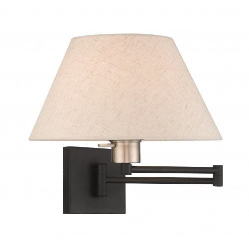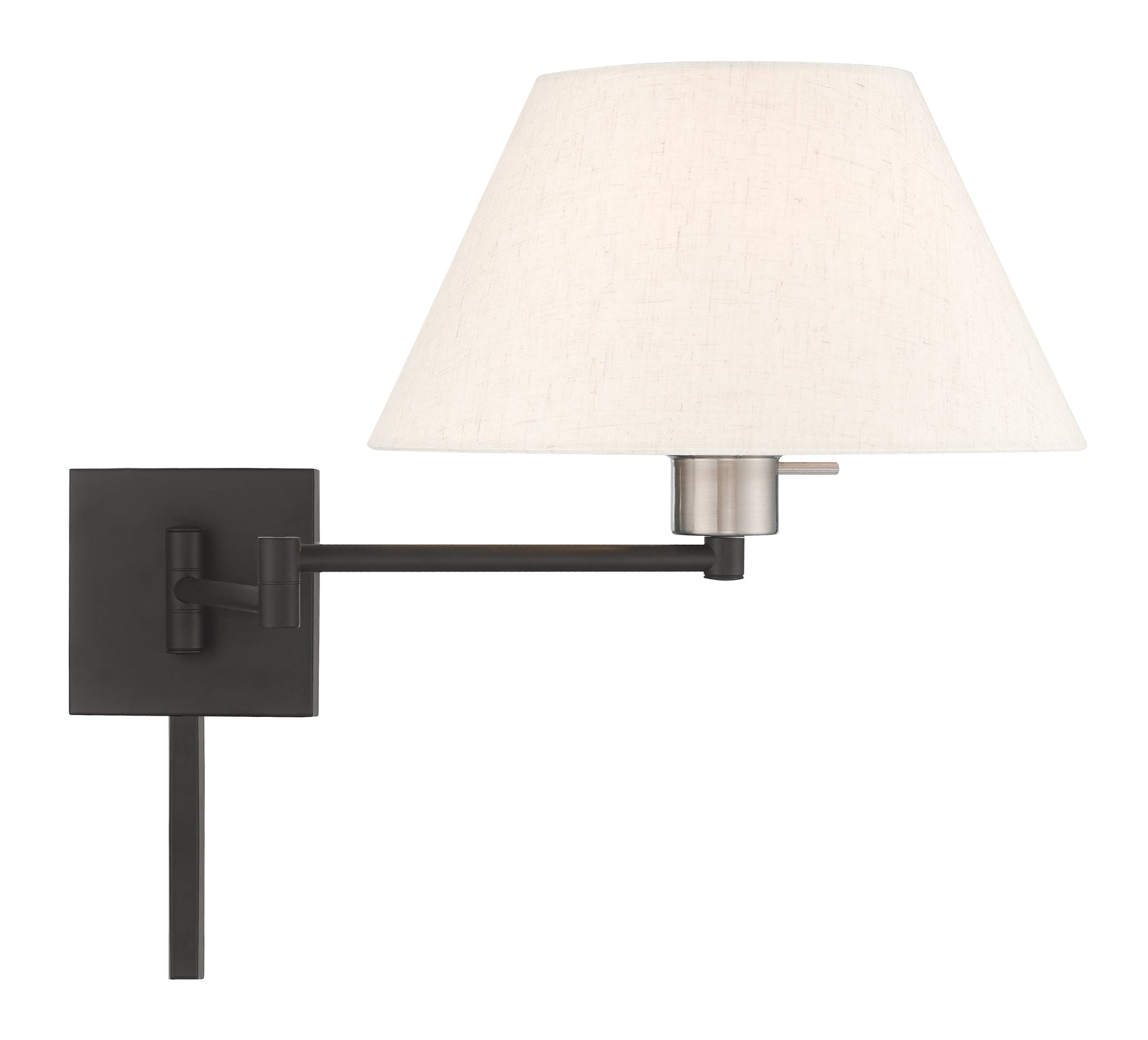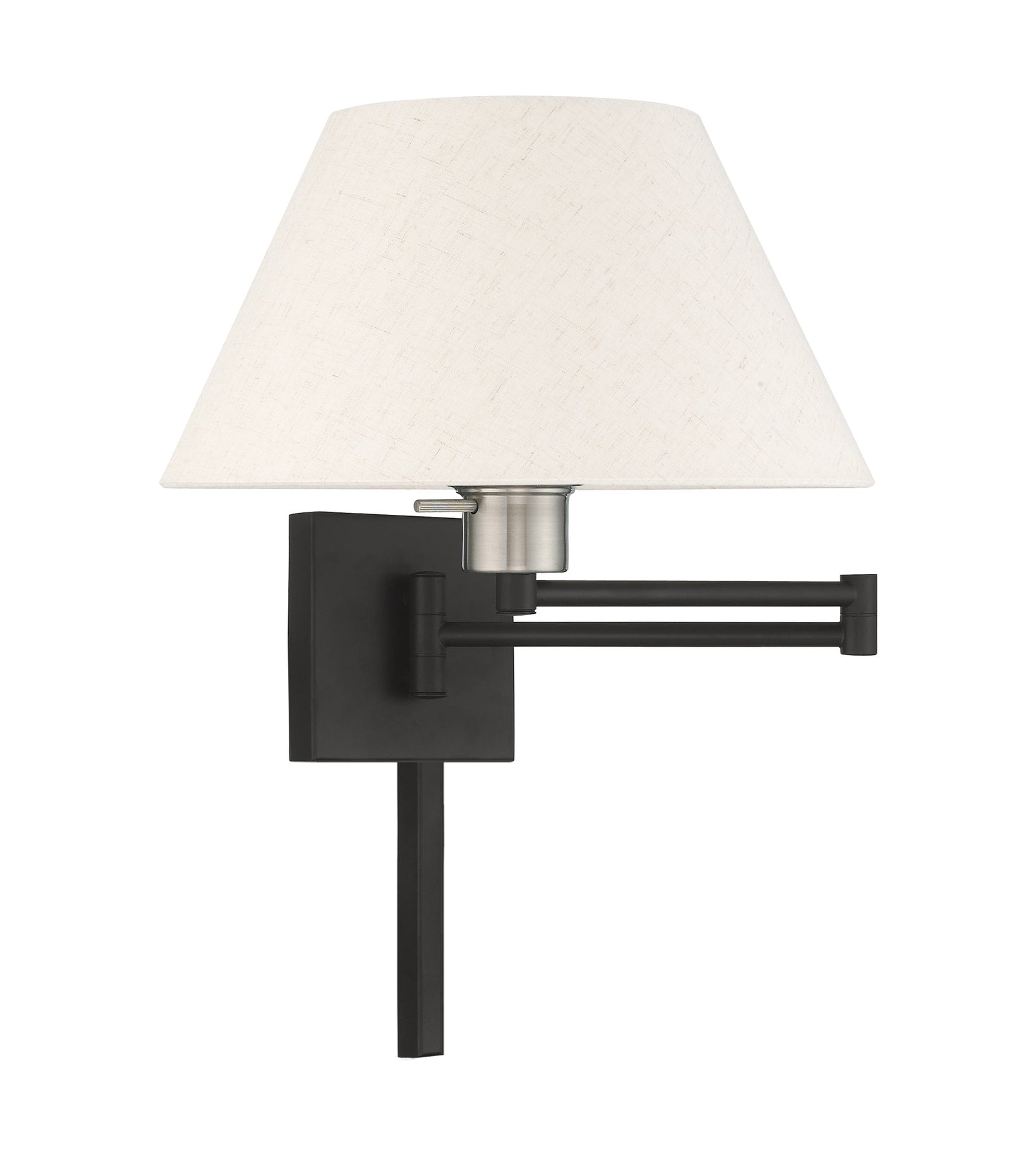 The 40038-04 Swing Arm Wall Lamp is a perfect addition to enhance your lighting experience beside your bed or reading nook. This stylish fixture features a sleek black finish complemented by a brushed nickel accent. It is designed with a hand-crafted oatmeal fabric hardback shade that provides a warm and inviting glow. With dimensions of 13 inches in width and 12 inches in height, it extends 25 inches for customizable positioning. This lamp operates with one medium base bulb (not included), with a maximum wattage of 100W, and includes a convenient 3-way switch for versatile lighting options. Suitable for damp locations, it comes with two 12-inch cord covers and an 8-foot cord, offering both plug-in and hardwired installation options.