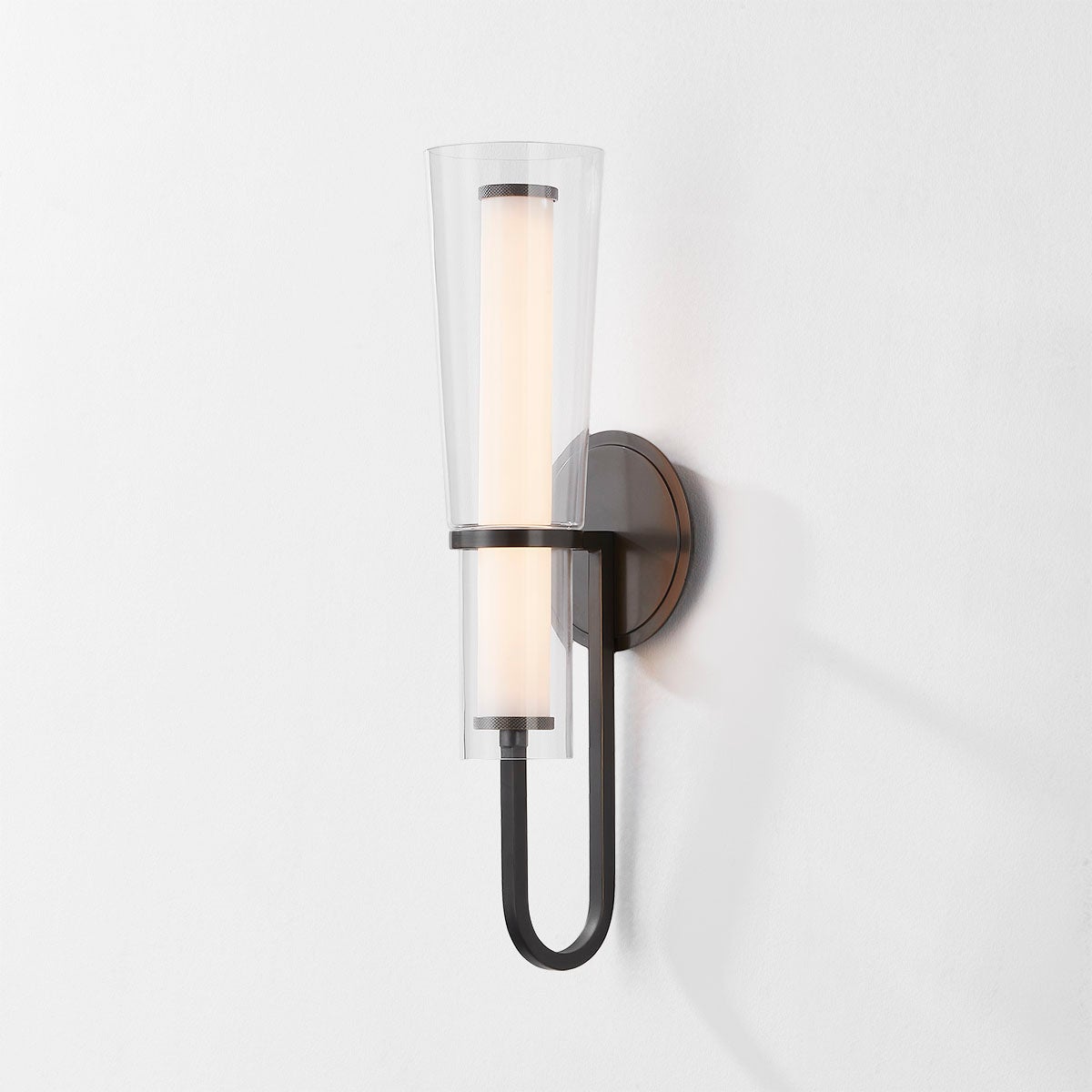 The Vancouver Wall Sconce by Hudson Valley Lighting combines sleek design with practical functionality. Measuring 5.50 inches in width and 20.00 inches in height, this stylish sconce features a 6.00-inch extension and is designed to house an integrated LED with 8.00 watts of power consumption. The shade, crafted from durable acrylic and glass, radiates a warm 2700K color temperature with a high CRI of 90, ensuring vibrant illumination at 300 lumens. This sconce is field serviceable and not plug-in, making it versatile for various applications, though it is not Title 24 compliant. Available in two elegant finishes: Aged Brass and Old Bronze, it is a perfect choice for both contemporary and traditional interiors.