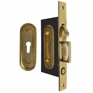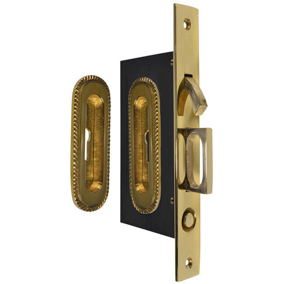 Georgian Pattern Single Pocket Privacy (Lock) Style Door Set (Polished Brass) - this set is a designed for a locking pocket door (such as a bathroom or study door). The flush pulls are installed on either side of the door and the mortise latch/edge pull pull is installed into the side of the door to pull the door shut easily and can lock into the door jamb.