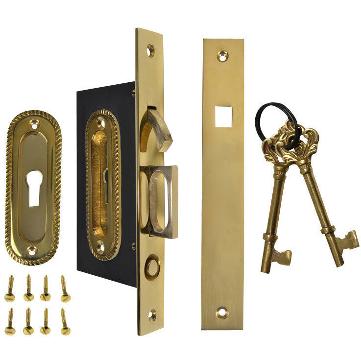 Locking systems require doors with at least 1 3/4'' thickness. Dummy and passage style pocket door hardware is also available. The lock boxes measure approximately 3 1/4 inches deep (including lip) and 5 1/8 inches high. The lock has a 2 inch backset. Works with a standard skeleton key and comes complete with an ornate set of skeleton keys. Solid Brass construction for decades of service. Made to be routed into the door - and comes complete with the mounting hardware.