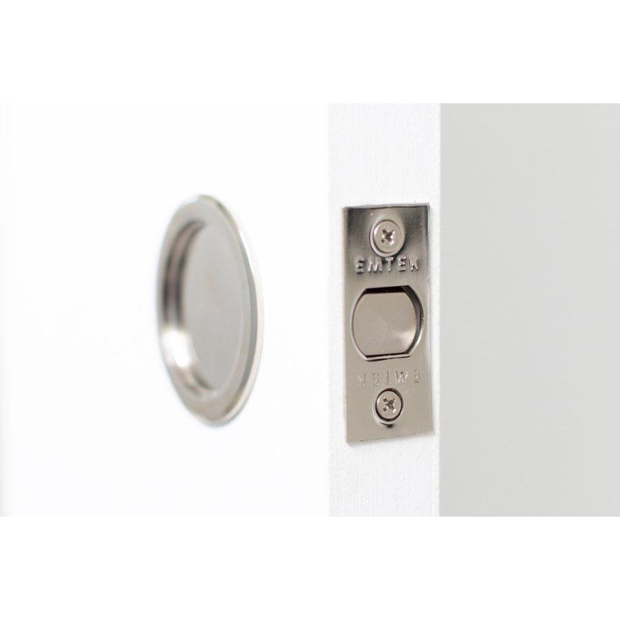This tubular passage set is designed for a pocket door (such as a bathroom or study door). It is constructed from solid brass and measures 2 1/2 inches in diameter. This item is available in passage (shown), privacy and double doors. Comes in a variety of finishes. The average lead time for this pocket door set is approximately 3 to 5 business days.