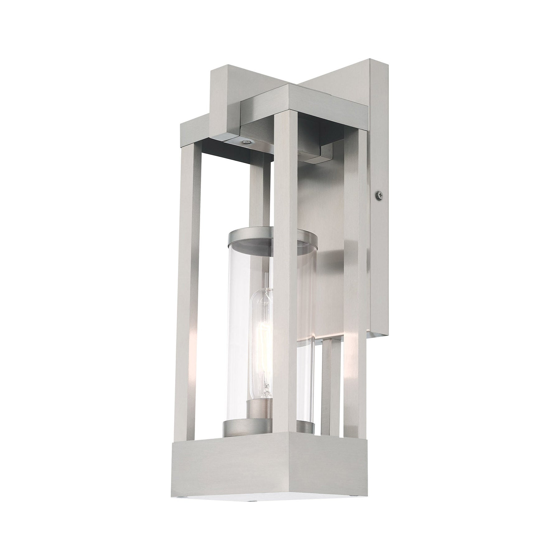 The Delancey Outdoor Wall Lantern (Item number: 20992-91) is a stunning addition to any modern outdoor space. This fixture features a sleek brushed nickel finish and a hand-crafted solid brass frame. Measuring 16 inches in height and 6.25 inches in width, it includes a clear glass cylinder that beautifully showcases a single medium base bulb (not included) with a maximum wattage of 60W. With an extension of 6 inches, it is perfect for illuminating entryways and patios. Rated for both damp and wet locations, this contemporary lantern is designed to withstand the elements while enhancing your outdoor decor.