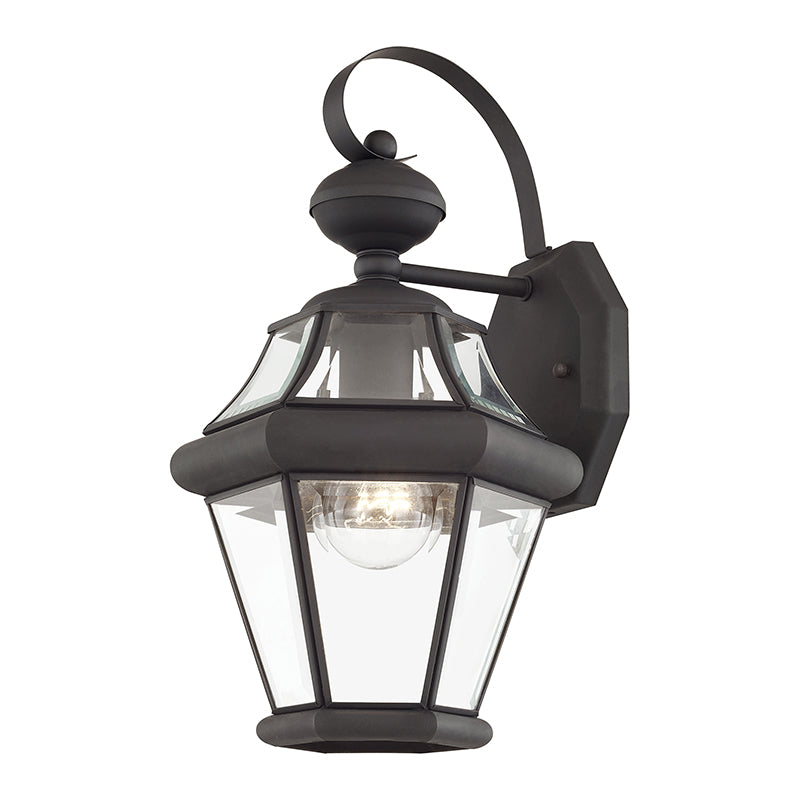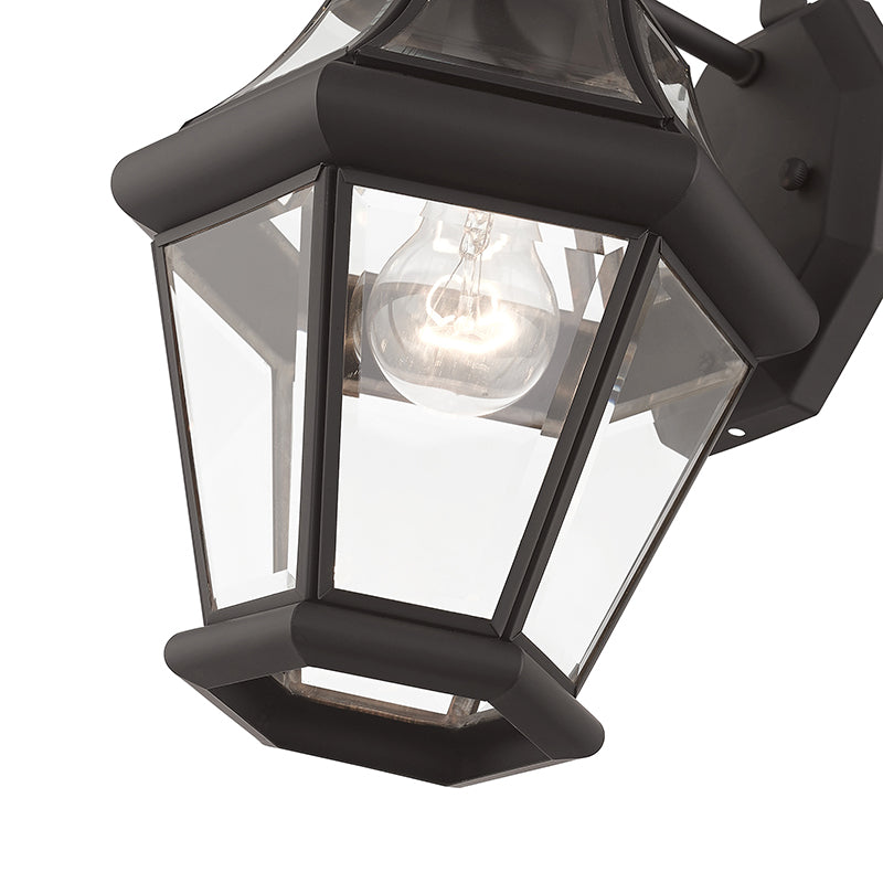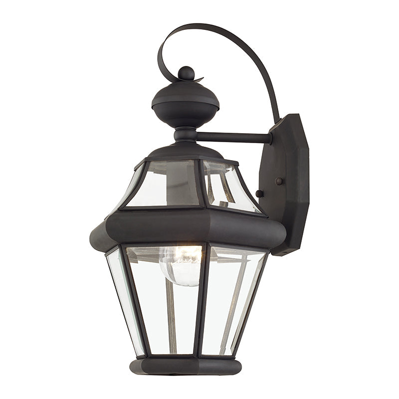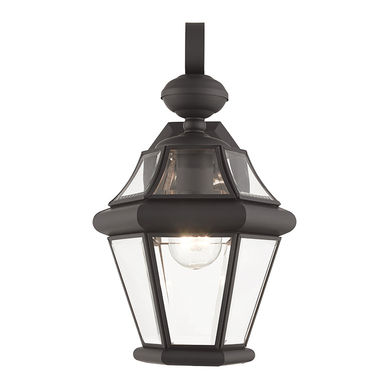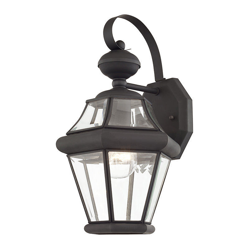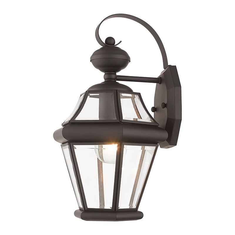 The Georgetown Wall Lantern (Item number: 2161-07) is a stunning addition for those who appreciate regal elegance in their lighting choices. Crafted from hand-finished solid brass, this traditional wall sconce stands 15 inches tall and measures 8.25 inches in width, with an extension of 8 inches. Its clear beveled glass shade beautifully complements the bronze finish, allowing for a warm glow from the single medium base bulb (not included) with a maximum wattage of 100W. Designed to withstand the elements, this fixture is suitable for both damp and wet locations, making it a versatile choice for any indoor or outdoor space.