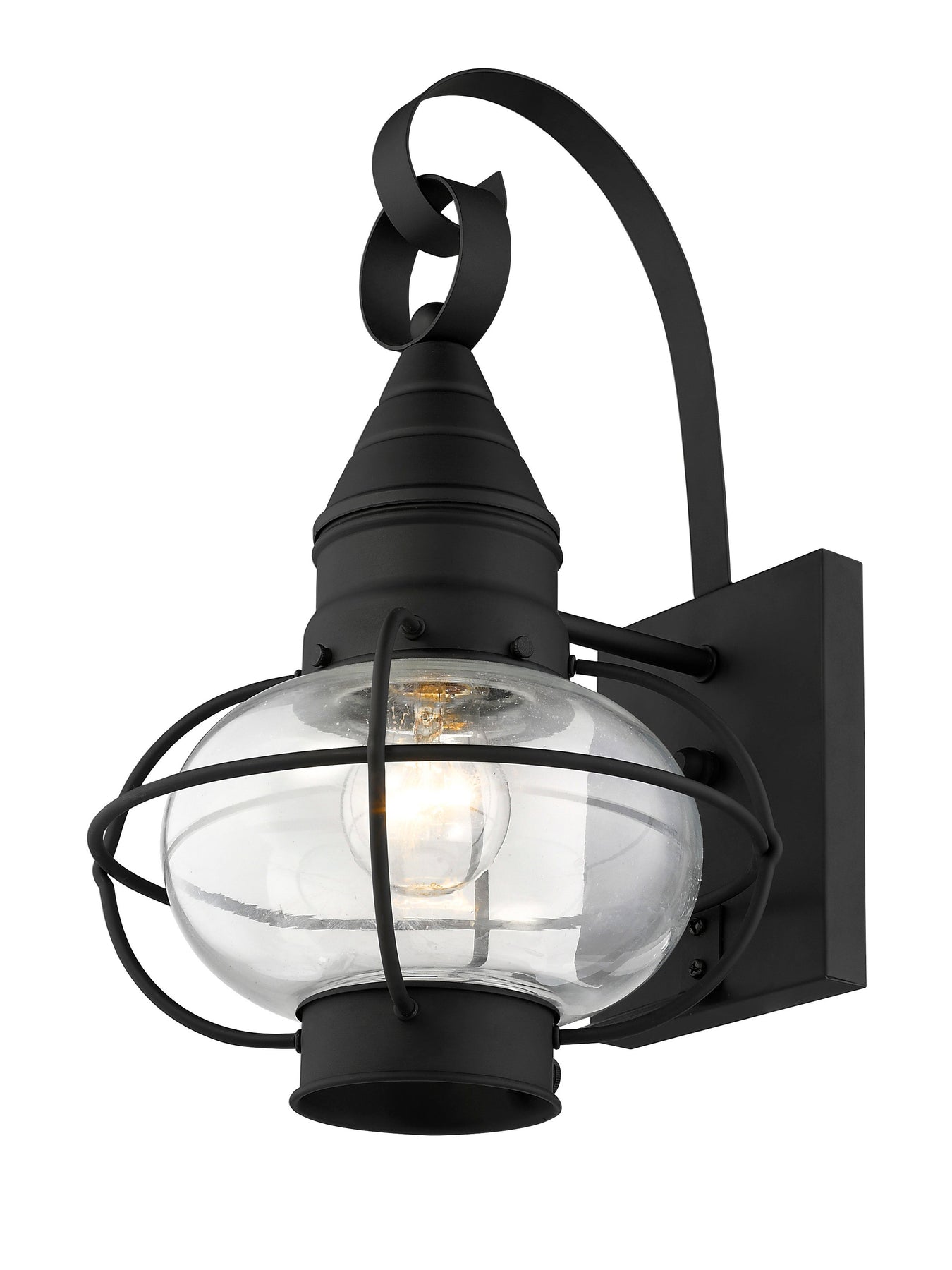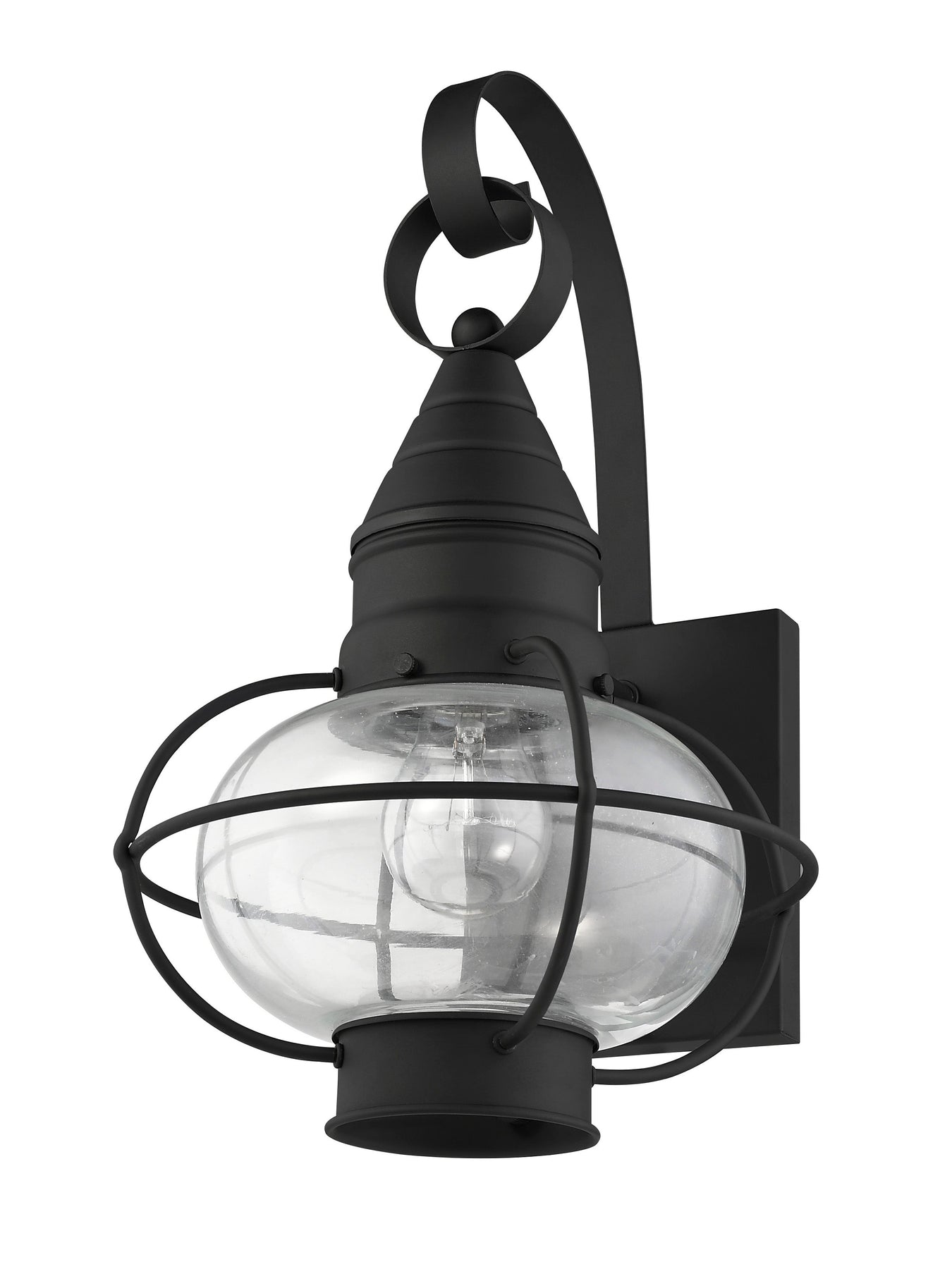 The Newburyport outdoor wall lantern is a stunning blend of traditional nautical and railway styling, crafted from hand crafted solid brass with a sleek black finish. Featuring a hand blown clear glass globe, this fixture is designed for durability and elegance. It measures 8.75 inches in width and 14.75 inches in height, with an extension of 9.75 inches, making it a perfect fit for a variety of outdoor spaces. This lantern accommodates one medium base bulb with a maximum wattage of 100, providing ample illumination. Additionally, it is rated for both damp and wet locations, ensuring that it can withstand the elements while enhancing your outdoor decor.