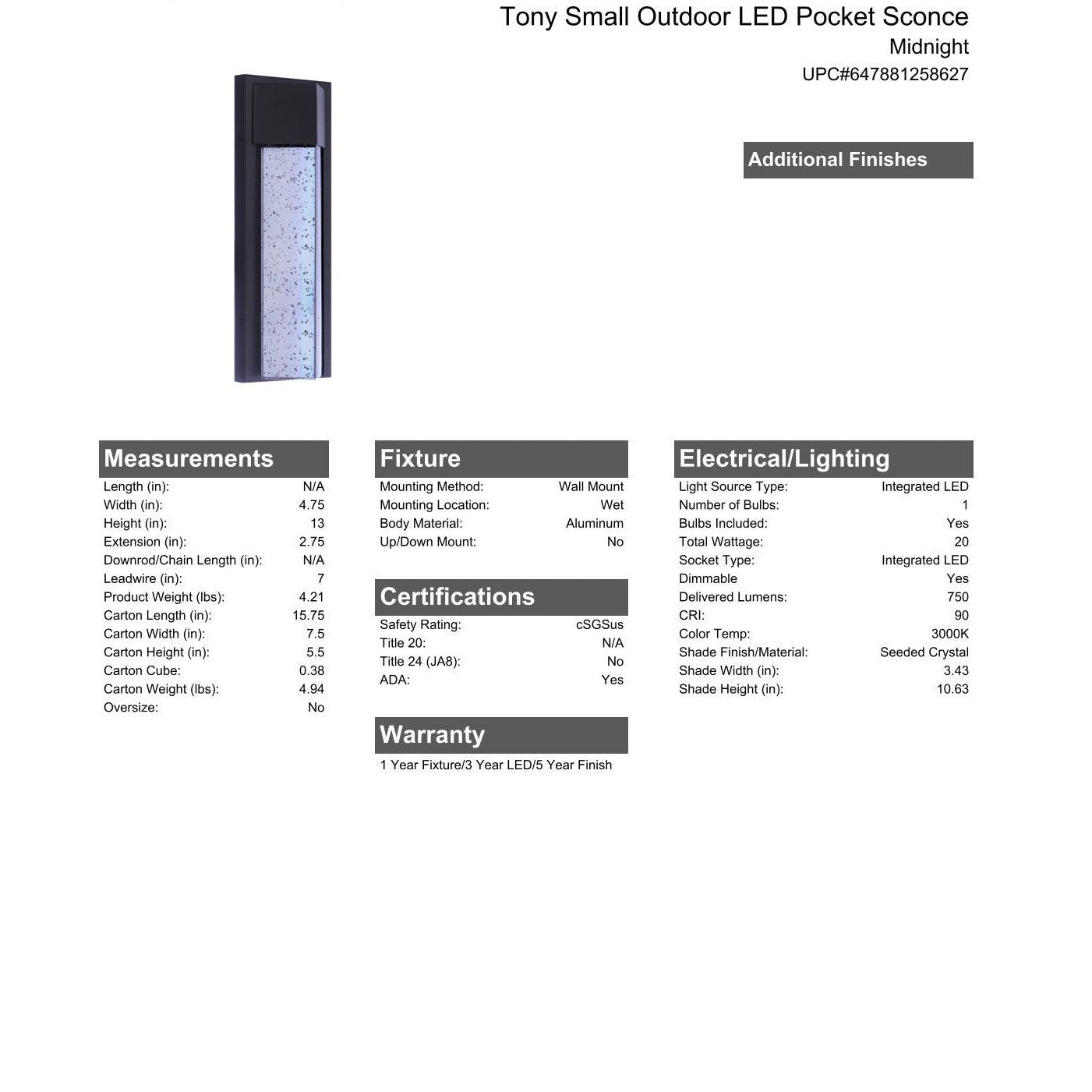 Tony Small Outdoor LED Pocket Sconce in Midnight
