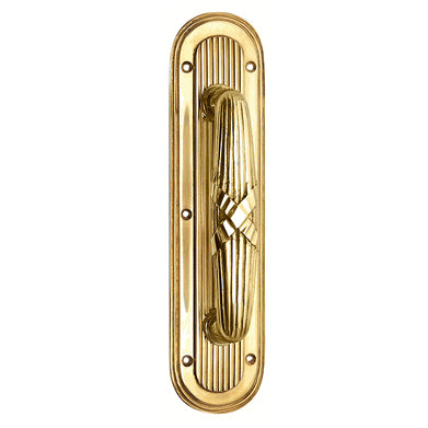 Art Deco Style Door Pull & Plate (Polished Brass Finish): measures 10 1/2 inches tall and 2 5/8 inches wide with a projection of 2 1/2 inches. Solid brass construction for decades of service. Comes complete with mounting hardware.