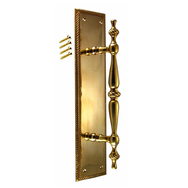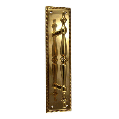Georgian Roped Style Door Pull & Plate (Antique Brass Finish): measures 11 1/2 inches tall and 3 inches wide. Solid brass construction for decades of service. Comes complete with mounting hardware.