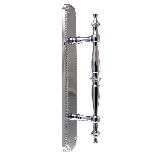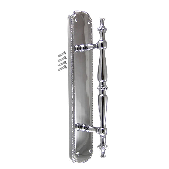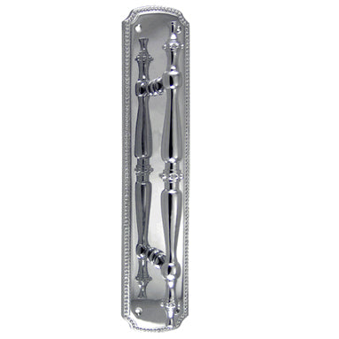 This beaded style pull & plate is finished in an attractive polished chrome. Measures 11 1/2 inches tall and 2 1/2 inches wide. Solid brass construction for decades of service. Comes complete with mounting hardware.