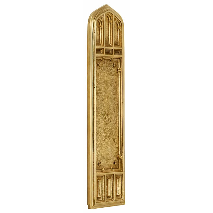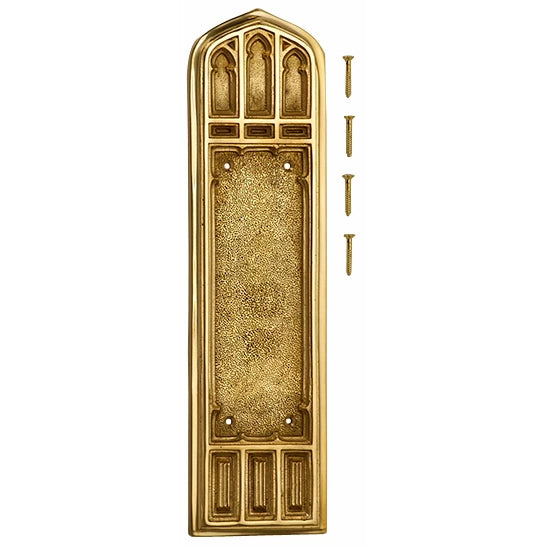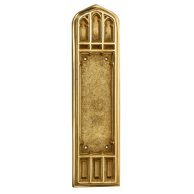 Gothic Push Plate (Polished Brass) - measures 12 1/4 inches by 3 1/4 inches. Highly ornate detailing and solid brass construction. Available in several finishes.