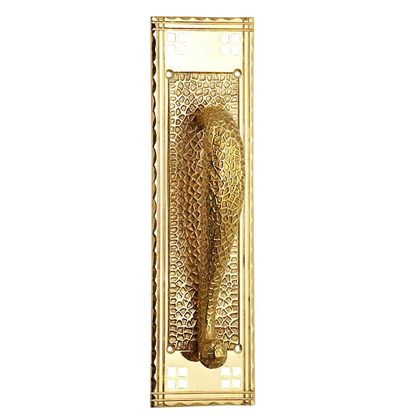 12 Inch Arts & Crafts Style Door Pull & Plate (Lacquered Brass Finish) - measures 12 inch tall and 3 1/2 inch wide with a projection of approximately 2 1/2 inch. Craftsman Style construction for decades of service. Comes complete with mounting hardware. Coordinating push plates and individual door pull also available. Please email customerservice@lookintheattic.com to place a custom order for this knob.