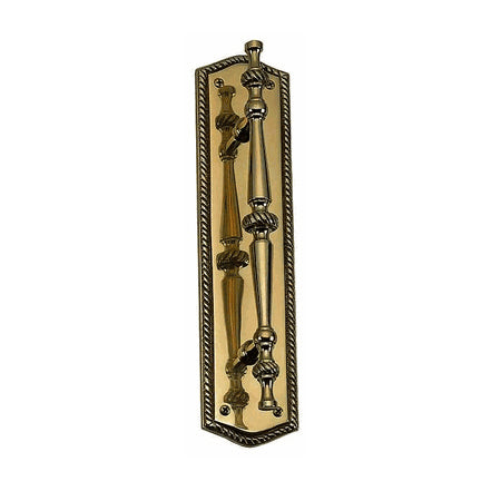 Georgian Oval Roped Style Door Pull & Plate (Antique Brass Finish): measures 12 inches tall and 3 inches wide. Solid brass construction for decades of service. Comes complete with mounting hardware.