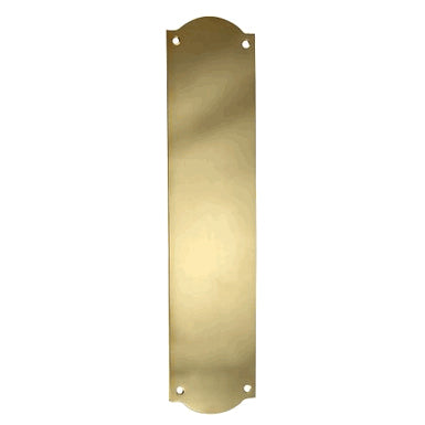 This oval shaped push plate is finished in polished brass and made from solid brass material. Measures 12 inches long and 3 inches wide and comes complete with mounting hardware.