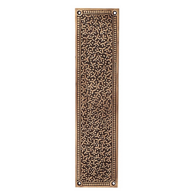 12 Inch Solid Brass Rice Pattern Push Plate (Antique Brass Finish). Plate measures 12 inch tall and 3 inch wide. Solid brass construction allows for decades of service. Comes complete with mounting hardware. Available in several finishes.