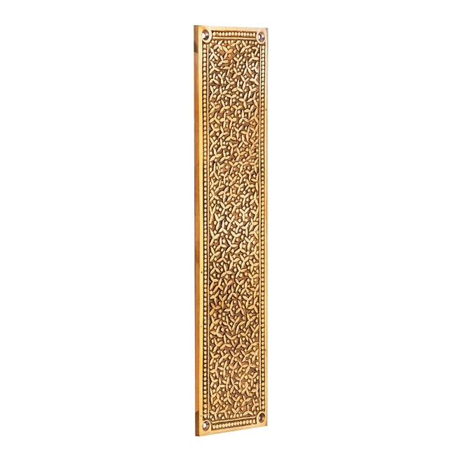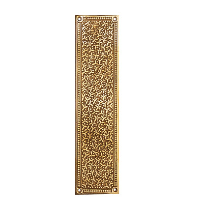 12 Inch Solid Brass Rice Pattern Push Plate (Polished Brass Finish). Plate measures 12 inch tall and 3 inch wide. Solid brass construction allows for decades of service. This product comes as an unlacquered natural brass and it will patina over time. A high strength lacquer coating is available upon request. Comes complete with mounting hardware.