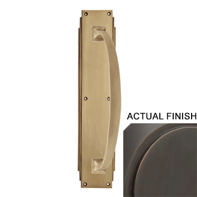 14 Inch Solid Brass Art Deco Skyscraper Pull Plate (Antique Brass Finish) - This plate features an art deco style design, is hand finished, and crafted from solid brass. Each plate measures approximately 3 inch wide by 14 inch tall and each pull handle measures approximately 11 inches tall (10 inches center to center). Comes complete with mounting hardware. Available in several finishes.